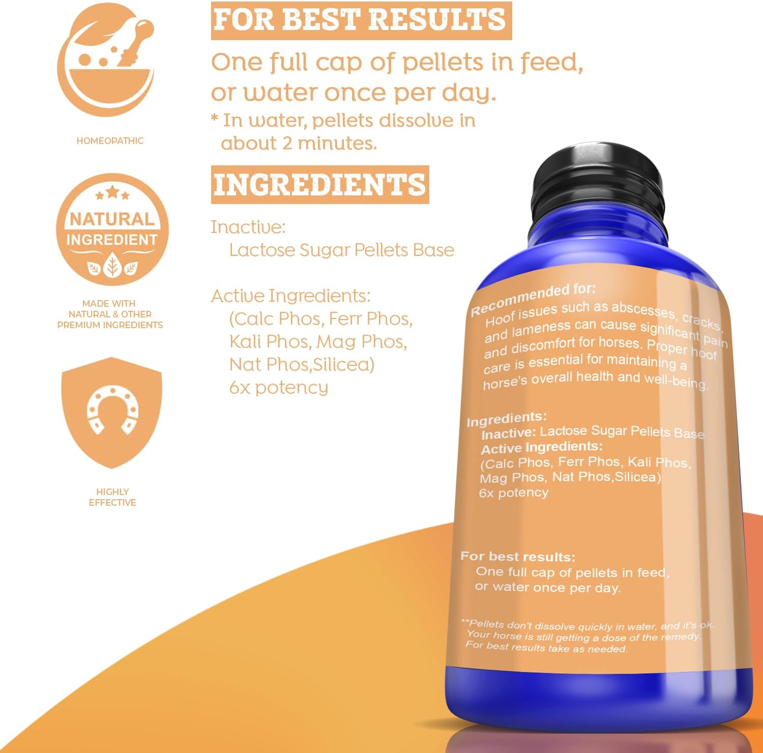 ADVANCED RECOVERY FORMULA: Provide unparalleled healing and recovery for your horse's hooves with our scientifically developed formula. Specially crafted to address various hoof injuries, reducing discomfort, and promoting faster recovery. Put your beloved pets' health first with Healthy Animals 4Ever’s All-Natural Horse Hoof SupportQUICK RECOVERY: Ensure continuous care and support for your equine companion with our generous 300 count supply. Experience a full month of effective hoof care management without any interruptions and see quick results as your injured horse rapidly gains its strength backEASY APPLICATION: No fuss or stress during wound care. Our dissolvable pellets are effortless to administer. Simply add a cap of pellets to your horse's drinking water for hassle-free consumption, or mix with their favorite feedSAFE SUPPLEMENTS FOR YOUR BELOVED PETS: Have complete peace of mind as you care for your pets with this all-natural, organic, non-GMO, gluten free, preservative free, and chemical free supplement. Developed with the same care and quality you’d expect from your own supplements, this specially designed pet formula was carefully crafted in an FDA registered facility to ensure the highest possible standards