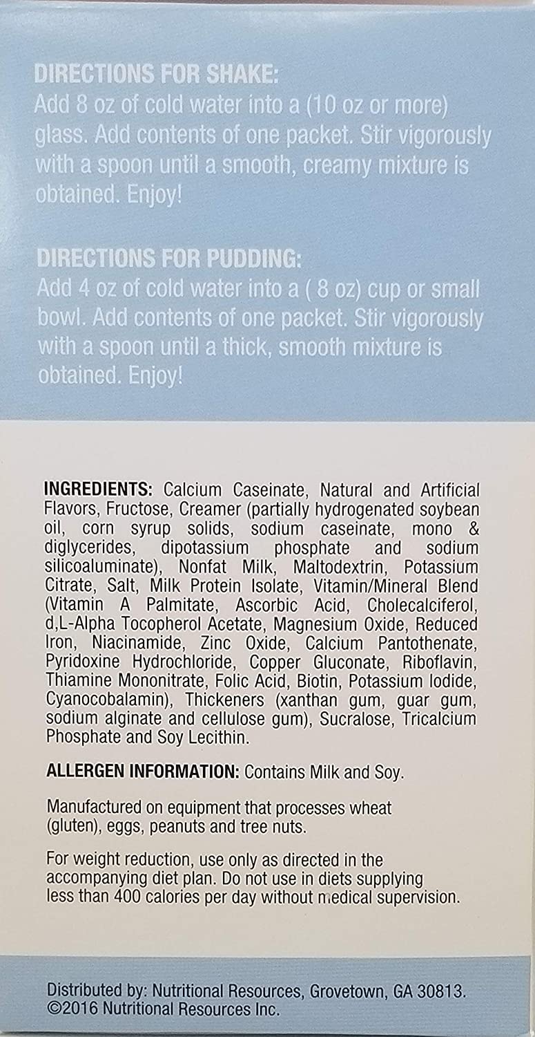 Directions: FOR A SHAKE : Place the contents of one packet into a (10 oz) glass, shaker cup, or blender. Add 8 ounces of cold water and stir or shake vigorously until dissolved. Nonfat milk may be substituted for water. FOR A PUDDING : Place the contents of one packet into a small cup or bowl. Add 4 ounces of cold water and mix thoroughly with a spoon until smooth and serve. Pudding thickens upon standing. Nonfat milk may be substituted for water