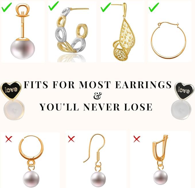 Heart-Shaped Silicone Earring Backs for Women. Designed for drop, stud, hoop, and even heavy earrings, these soft yet durable rubber stoppers provide a snug fit that prevents earrings from slipping or falling out.