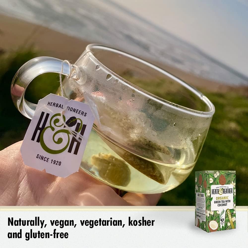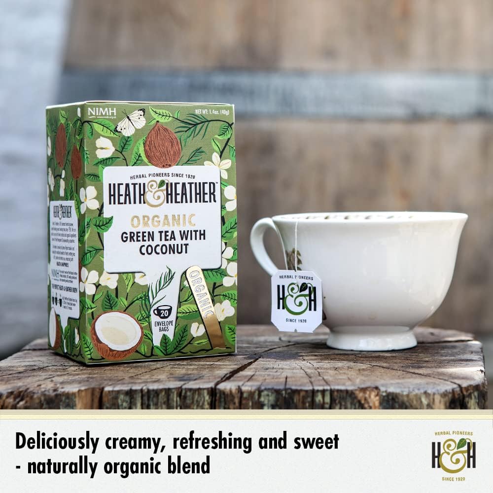 Heath & Heather Organic Green Tea With Coconut (6 Packs Of 20, Total 120) Individually Wrapped Herbal Tea Infusions
