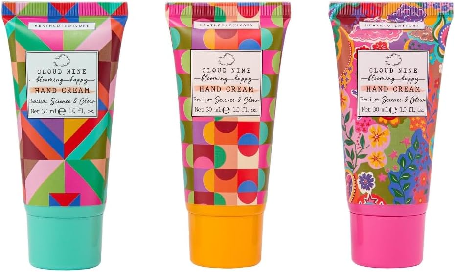 Product Description Feel on Cloud Nine with three travel sized shea butter hand creams infused with a zingy, happy fragrance. Unleash the power of innovative, happiness inducing fragrance technology with our special blend of uplifting orange, lemon, mandarin and bergamot essential oils. Perfectly sized for pockets and blended with hydrating shea butter, glycerin and antioxidant vitamin E. The hand creams are supercharged with conditioning custard apple extract and vit-C rich cloudberry seed oil to further replenish and hydrate. Skin feels soft, happy and delicately scented. Feel the cheery effect of brightly coloured flowers and patterns with our recipe of Science and Colour. Our hand creams come in recyclable, recycled plastic tubes and are cruelty free and vegan. Ingredients Aqua/Water/Eau, Cetearyl Alcohol, Caprylic/Capric Triglyceride, Glycerin, Ceteareth-25, Glyceryl Stearate, Parfum (Fragrance),Butyrospermum Parkii (Shea) Butter, Phenoxyethanol, Carbomer, Ceteareth-6, Rubus Chamaemorus (Cloudberry) Seed Oil, Sodium Hydroxide, Disodium EDTA, Glyceryl Caprylate, Glyceryl Laurate, Tocopheryl Acetate (Vitamin E), Panthenol (Pro-Vitamin B5), Annona Cherimolia (Custard Apple) Fruit Extract, Butylene Glycol, Hydroxyacetophenone, Citrus Aurantium Dulcis (Orange) Peel Oil , Citrus Nobilis (Mandarin) Peel Oil, Citrus Limon (Lemon) Peel Oil, Citrus Aurantium Bergamia (Bergamot) Peel Oil, Limonene, Citral, Linalool, Geraniol, Citronellol, Hydroxycitronellal. P.when('A').execute(function(A) { A.on('a:expander:toggle_description:toggle:collapse', function(data) { window.scroll(0, data.expander.$expander[0].offsetTop-100); }); }); Safety Warning For external use only. Avoid contact with eyes. Keep away from naked flame or direct heat sources. See more,VEGAN HAND CREAM SET - Experience a blissful sensation as you pamper your hands with our travel-sized shea butter hand creams. Infused with a delightfully zingy and uplifting fragrance, these mini hand cream sets feature skin-loving extracts of cloudberry seed and custard apple. Enjoy the heavenly feeling of care. Keep your hands feeling supple and revitalized with our deeply hydrating hand cream set, your secret weapon against the harsh elements,THOUGHTFUL GIFT - Delight your loved ones with a gesture of indulgence by gifting them our beautifully packaged hand cream gift set. This luxurious present wraps their hands in soothing care and a delightful fragrance, making our mini hand cream multipack a perfect surprise for any occasion,EYE CATCHING DESIGNS & PREMIUM INGREDIENTS - Experience the transformative effect of our innovative fragrance technology, designed to induce happiness through a unique blend of uplifting orange, lemon, mandarin, and bergamot essential oils. Each hand cream comes adorned in a distinct Cloud Nine design, featuring vibrant flowers and patterns, creating a cheerful and colorful fusion in our harmonious blend of Science and Colour,TRAVEL FRIENDLY - Our hand creams are packaged in environmentally friendly tubes made from recyclable, recycled plastic, and they are both cruelty-free and vegan. This travel set is meticulously crafted for convenience, featuring a compact hand cream gift that fits perfectly in your pocket, tote, or drawer. It's a thoughtful choice for travel gifts for women, providing an ideal solution with a touch of consideration,QUALITY MATTERS - QUALITY MATTERS - For over two decades, Heathcote & Ivory has earned acclaim for crafting award-winning, beautifully scented products and gifting collections in bath, body, wellness, and lifestyle. Infused with British wit and charm, our commitment to the highest sustainability standards drives continuous innovation and excellence. At Heathcote & Ivory, we steadfastly believe in delivering the best quality products to our customers because, above all, quality matters