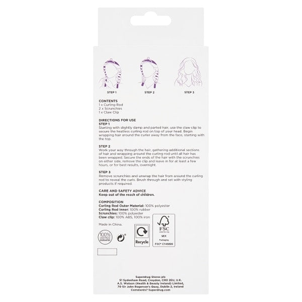 Use The Superdrug Heatless Curls Kit To Create Effortless Curls While You Sleep, All Without Heat! Contents 1 X Curling Rod 2 X Scrunchies 1 X Claw Clip Directions For Use Step 1 Starting With Slightly Damp And Parted Hair, Use The Claw Clip To Secure The Heatless Curling Rod On Top Of Your Head. Begin Wrapping Hair Around The Curler Away From The Face, Starting With The Top. Step 2 Work Your Way Through The Hair, Gathering Additional Sections Of Hair And Wrapping Around The Curling Rod Until All Hair Has Been Wrapped. Secure The Ends Of The Hair With The Scrunchies On Either Side, Remove The Clip And Leave In For At Least A Few Hours, Or For Best Results, Overnight. Step 3 Remove Scrunchies And Unwrap The Hair From Around The Curling Rod To Reveal The Curls. Brush Through And Set With Styling Products If Required. Care And Safety Advice Keep Out Of The Reach Of Children. Composition Curling Rod Outer Material: 100% Polyester Curling Rod Inner: 100% Rubber Scrunchies: 100% Polyester Claw Clip: 100% Abs, 100% Iron