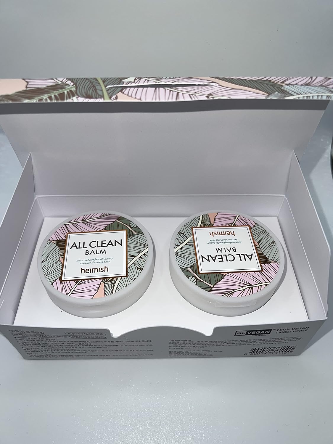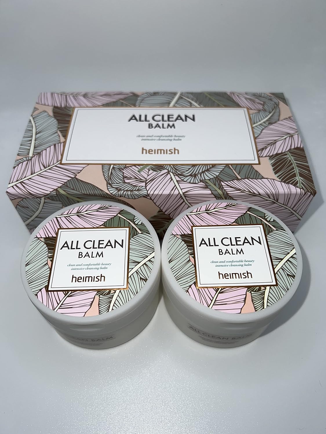 ABOUT THE PRODUCT: 1 > Quickly dissolves into oil when in contact with skin and removes Make-up (especially waterproof), dirt, sunscreen 2 > Washes off easily with water without leaving any residue Convenient mini spoon included to help scoop clean and adequate usage 3 > Gently cleanses the face without removing any skin layers and Clears up any blackheads and clogged poresHeimish All Clean Balm Heimish, cleansing balm, melt down makeup, makeup remover, balm to oil, all skin type Key Ingredients Shea Butter Citrus Herb OIl Coconut Extract White Flower Complex Multi-Cleansing that completely removes heavy makeup Contains Coconut Extract and Shea Butter which melts upon contact with skin and provides deep cleansing to remove all makeup and dirt. All Clean Balm is a balm cleanser that improves on a normal oil cleanser. Developed to have the strong cleansing power of an oil cleanser without the inconveniences of oil cleansers. Just on Single Step The flip top lid makes it easier to open the jar! There's spatula inside of the lid for your convenience!