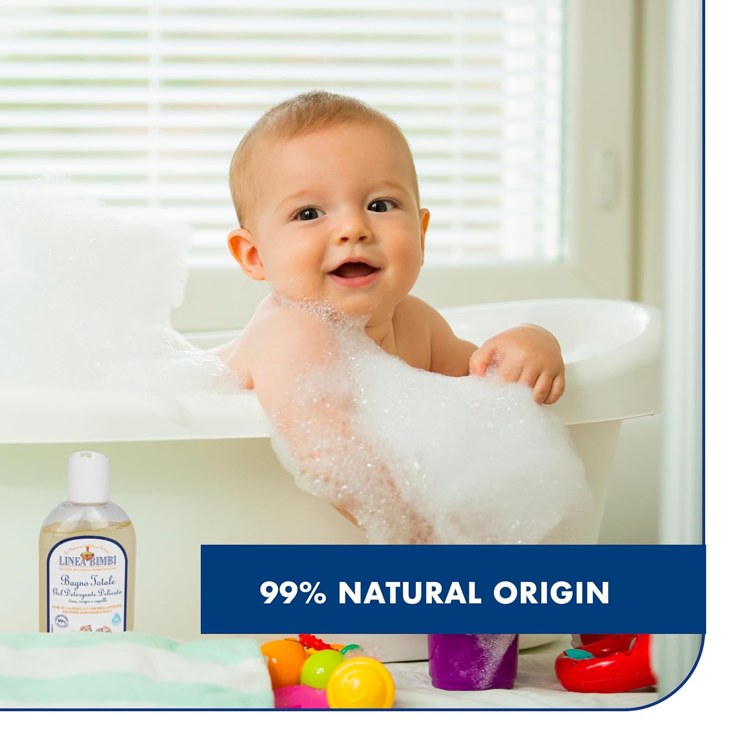 GENTLE ON THE BODY: This mild cleansing base, enriched with sweet almond protein and extracts of calendula and chamomile flowers, removes impurities without disturbing the delicate structure of the babyâs hair and skin