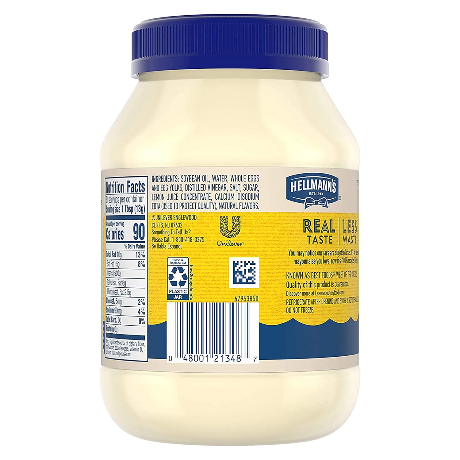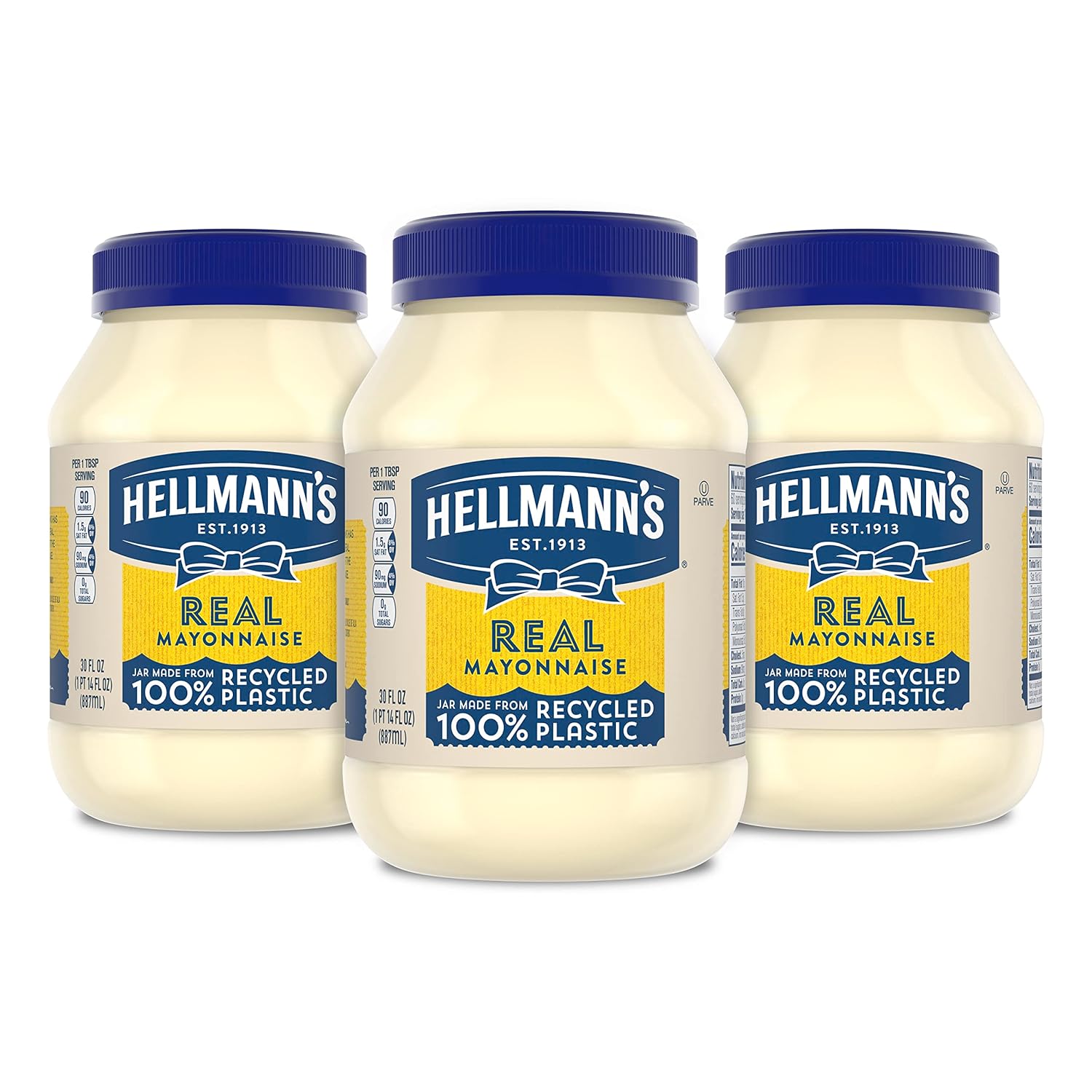 Hellmann's Real Mayonnaise is proudly made with real, simple ingredients like cage-free eggs, oil and vinegar. We know that to really Bring Out The Best, we need to do more than just taste great. Thatās why our delicious Blue Ribbon Quality Mayonnaise is made with real eggs, oil and vinegar sourced from trusted American farms. Even after 100 years, weāre still committed to using premium ingredients to craft the highest quality mayonnaise. It's simple. We use the finest, real ingredients in Hellmann's Real. In fact, we use 100% cage-free eggs and are committed to 100% responsibly sourced soybean oil. Our authentic mayonnaise is rich in Omega 3-ALA (contains 650mg ALA per serving, which is 40% of the 1.6g Daily Value for ALA), and is also gluten-free and certified kosher. And nothing beats the taste of real mayo. Itās the ideal condiment for spreading on sandwiches and wraps, grilling juicy burgers, mixing creamy dips, and preparing fresh salads. Use it to make outrageously delicious meals like our Parmesan Crusted Chicken and Best Ever Juicy Burger, and even turn your Thanksgiving leftovers into a deliciously creamy meal with our Turkey Casserole. Hellmannās is known as Best Foods west of the Rockies,Enjoy the creamy, delicious taste of Hellmannās Real Mayonnaise, a naturally gluten-free condiment,This gluten-free mayo is made with real, simple ingredients like 100% certified cage-free eggs, oil and vinegar,An ideal condiment for spreading on sandwiches and wraps, grilling juicy burgers, mixing creamy dips, and preparing fresh salads and simple meals,This three-pack of real mayo is great to have on hand or in your pantry to transform your barbecue and everyday chicken dinner into a juicier, more delicious meal,Rich in Omega 3-ALA (contains 650mg ALA per serving, which is 40% of the 1.6g Daily Value of ALA), this is a great option for those looking for delicious gluten-free condiments,Hellmann's, Bring Out The Best