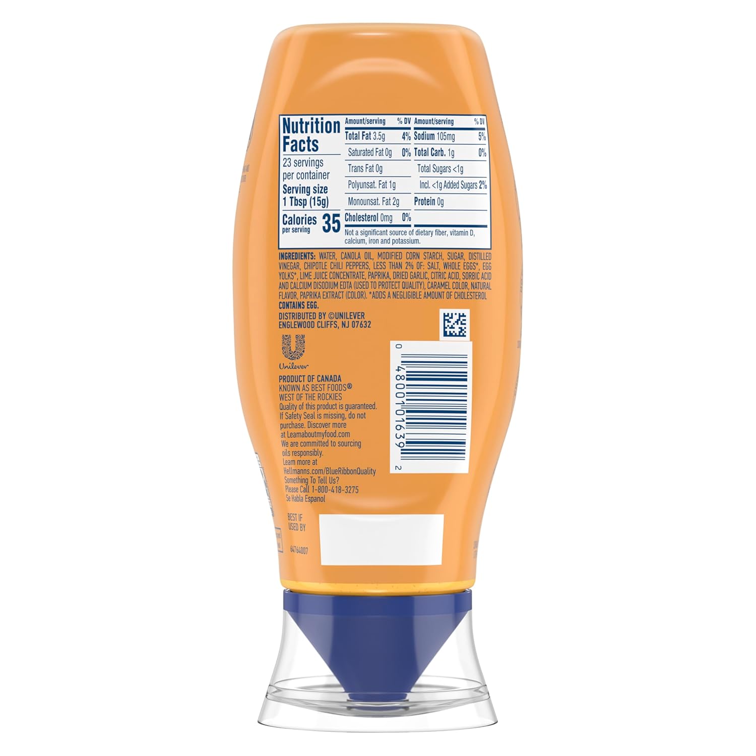 About this item DELICIOUS SMOKY FLAVOR: Hellmann's Chipotle Mayonnaise Dressing brings a smoky flavor and mild heat to spice up your meals. Deliciously Smoky, 100% Hellmann's. MADE WITH REAL CHIPOTLE PEPPERS: Hellmann's Chipotle Mayonnaise Dressing is made with real chipotle peppers and is the perfect addition to shrimp tacos, grain bowls, and more. NO ARTIFICIAL FLAVORS: Made with high-quality ingredients, this chipotle mayonnaise sauce contains no artificial flavors. NO CHOLESTEROL, TRANS FAT, OR SATURATED FAT: This spicy chipotle mayonnaise sauce is free from trans fat, saturated fat, and cholesterol. EXCELLENT SOURCE OF OMEGA 3 ALA: This chipotle mayo sauce is an excellent source of omega 3 ALA Contains 270mg of ALA per serving, which is 17% of the 1.6g daily value for ALA. Hellmann's, Bring Out The Best. See more product details,DELICIOUS SMOKY FLAVOR: Hellmann's Chipotle Mayonnaise Dressing brings a smoky flavor and mild heat to spice up your meals. Deliciously Smoky, 100% Hellmann's,MADE WITH REAL CHIPOTLE PEPPERS: Hellmann's Chipotle Mayonnaise Dressing is made with real chipotle peppers and is the perfect addition to shrimp tacos, grain bowls, and more,NO ARTIFICIAL FLAVORS: Made with high-quality ingredients, this chipotle mayonnaise sauce contains no artificial flavors,NO CHOLESTEROL, TRANS FAT, OR SATURATED FAT: This spicy chipotle mayonnaise sauce is free from trans fat, saturated fat, and cholesterol,EXCELLENT SOURCE OF OMEGA 3 ALA: This chipotle mayo sauce is an excellent source of omega 3 ALA Contains 270mg of ALA per serving, which is 17% of the 1.6g daily value for ALA,Hellmann's, Bring Out The Best
