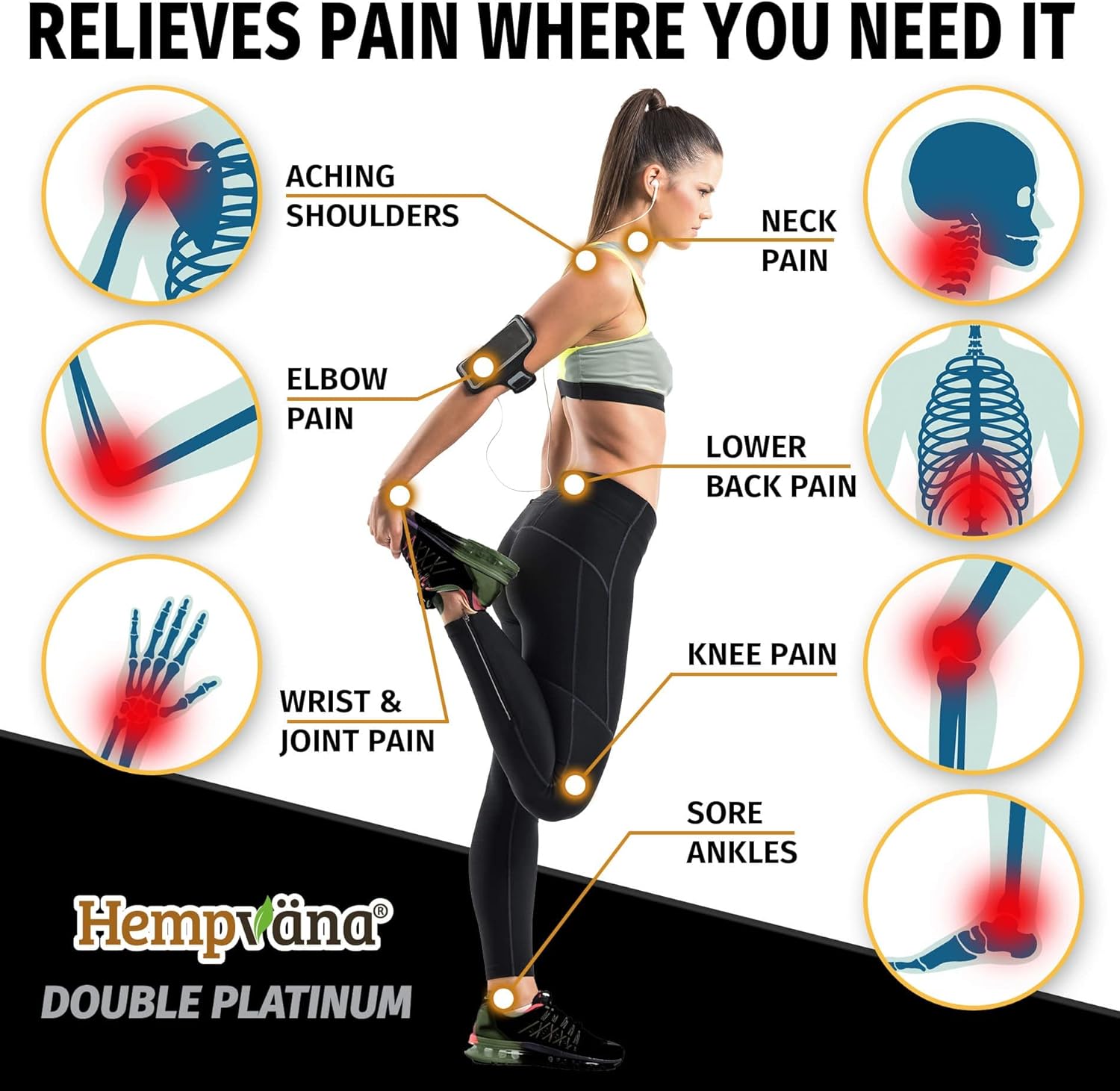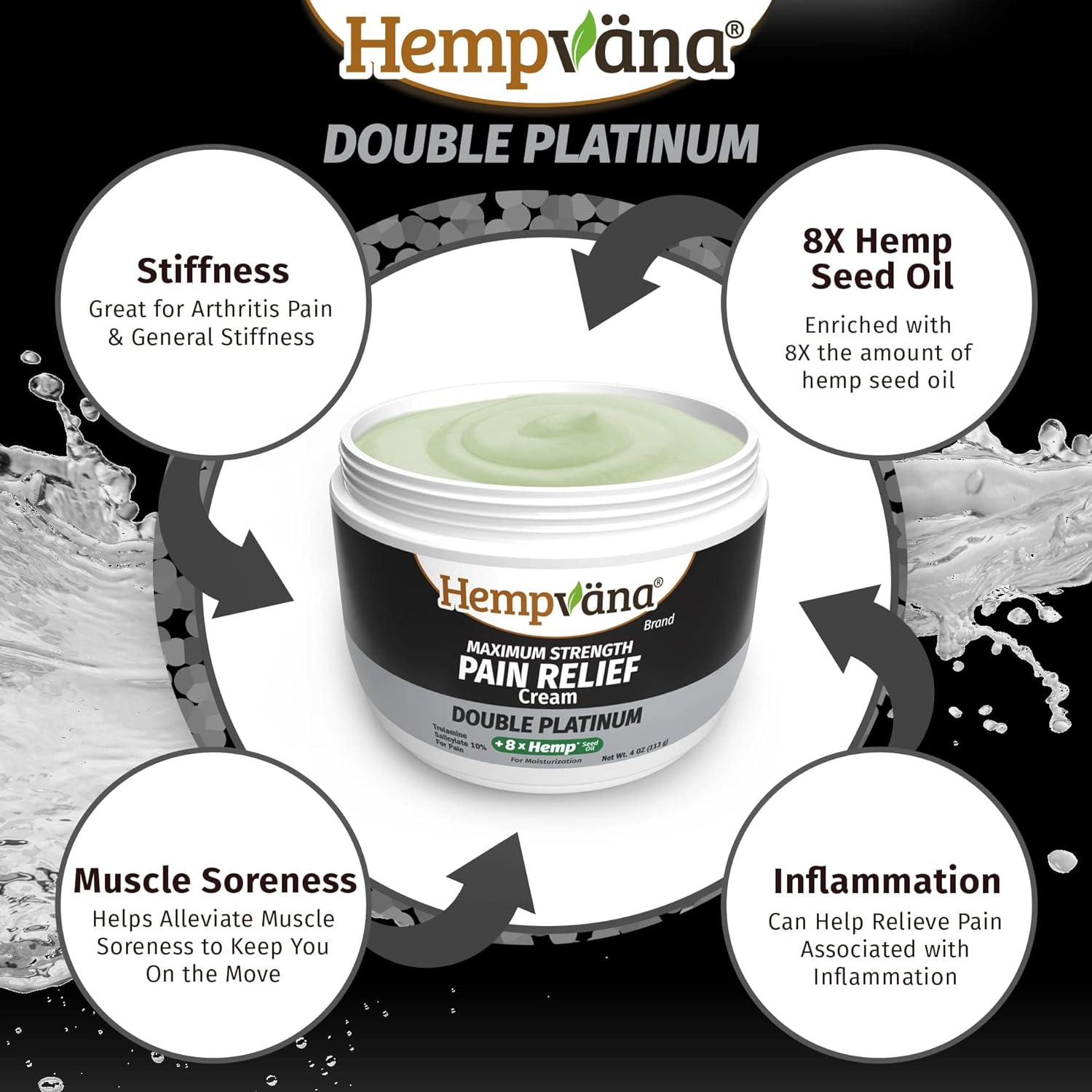 Works fast to temporarily relieve minor aches and discomfort associated with achy joints, simple backache, muscle strains, and sprains so you can enjoy life againHempvana Double Platinum has 8 TIMES the hemp seed oil, plus turmericFast-acting formula uses a clinically proven FDA-listed ingredient In a matter of minutes you can improve your range of motionOdor-free cream is non-greasy so there's no sticky residue on your hands or body and your clothing won't stickTarget pain where it hurts. Why treat pain with pills that treat your whole body when you can have targeted relief with Hempvana Double PlatinumLive life in less discomfort. Hempvana Double Platinum combines FDA-listed trolamine salicylate with 8 TIMES MORE hemp seed oil than our Original formula! Hempvana Double Platinum works great to relieve aches and discomfort from joint aches, backache, sore muscles,, and so much more! Just massage a little bit into the affected area. In minutes you’ll start to feel pain relief. Hempvana Double Platinum quickly absorbs into your skin so you can feel fast-acting relief and improve your range of motion again. Our non-greasy formula doesn't leave that sticky, gross feeling like other brands. Plus, Hempvana Double Platinum is odor-free so there is no lingering medicine smells. Enjoy the things you loved again. Walk, jog, and climb to new heights with the fast relief of Hempvana Double Platinum!