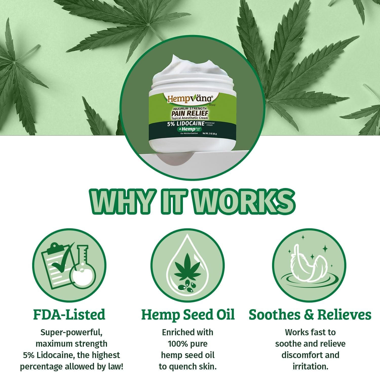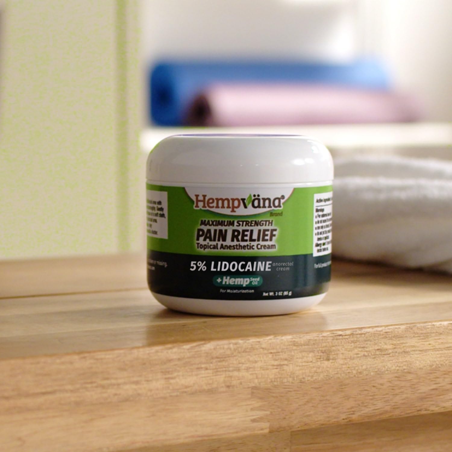 Hempvana Lidocaine 5% Relief Cream, As-Seen-On-Tv, Strongest Cream, Numbs Irritated Nerves For Fast Anorectal Relief, Enriched With Hemp Seed Oil, Non-Greasy & Odor-Free, 3-Oz Jar