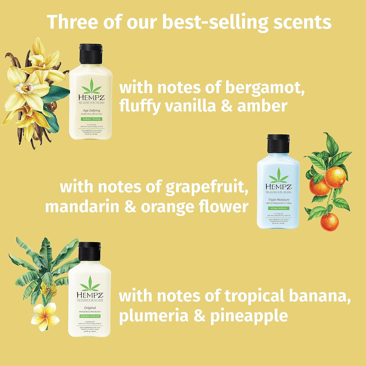 About this item Perfectly Portable - Ideal for on-the-go hydration, our mini travel size lotion bottles that fit easily in your purse, backpack, or carry-on. Keep your dry skin moisturized and refreshed, no matter where life takes you. Four Travel Size Lotions: Mini Vanilla Lux, Mini Tea Tree, Mini Original, Mini Sweet PIneapple and Honeymelon. HYDRATE: Helps replenish moisture with 100% pure hemp seed oil and naturally emollient shea butter FREE OF: Gluten Free, Cruelty Free, Always Vegan and made in the USA GIFT: Perfect for Mother's Day, Teacher Appreciation, Birthdays, Girls Night or a Thank You to yourself. See more product details,Perfectly Portable - Ideal for on-the-go hydration, our mini travel size lotion bottles that fit easily in your purse, backpack, or carry-on. Keep your dry skin moisturized and refreshed, no matter where life takes you,Four Travel Size Lotions: Mini Vanilla Lux, Mini Tea Tree, Mini Original, Mini Sweet PIneapple and Honeymelon,HYDRATE: Helps replenish moisture with 100% pure hemp seed oil and naturally emollient shea butter,FREE OF: Gluten Free, Cruelty Free, Always Vegan and made in the USA,GIFT: Perfect for Mother's Day, Teacher Appreciation, Birthdays, Girls Night or a Thank You to yourself