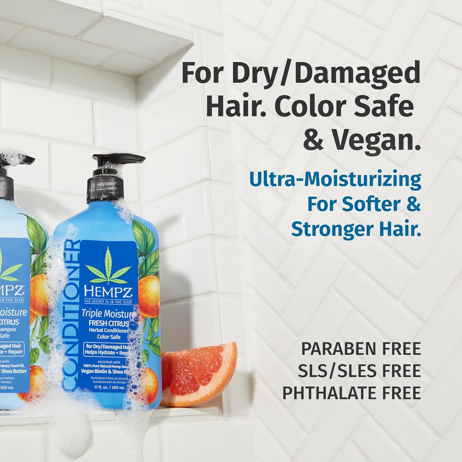 Hempz Biotin Conditioner - Triple Moisture Fresh Citrus - Peach & Grapefruit - For Growth & Strengthening Of Dry, Damaged And Color Treated Hair, Hydrating, Softening, Moisturizing - 33.8 Fl Oz