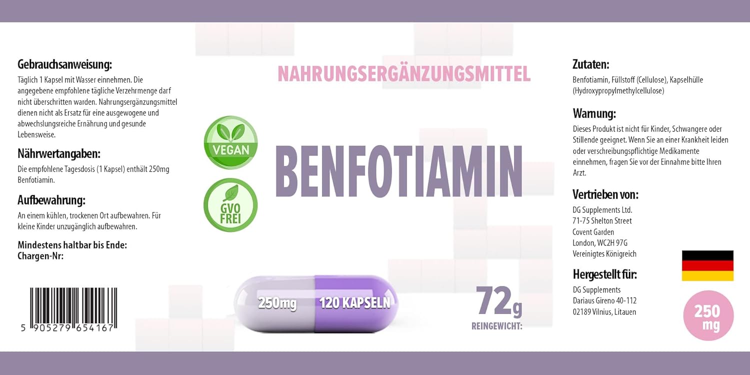 About this item ? High-Strength Benfotiamine β 250mg Per Capsule β A superior fat-soluble form of Vitamin B1 (Thiamine) for enhanced absorption and effectiveness. ? Supports Nerve Health β Helps protect nerves from oxidative stress, reducing nerve pain, tingling, and discomfort. ? Enhances Brain Function & Cognitive Clarity β May improve memory, focus, and mental sharpness, supporting long-term brain health. ? Boosts Energy & Fights Fatigue β Plays a crucial role in converting carbohydrates into energy, reducing tiredness and improving vitality. ? 120 Vegan Capsules β 4-Month Supply β A long-lasting, easy-to-swallow supplement, designed for consistent daily support. ? Pure & Clean Formula β No Fillers or Additives β Gluten-Free, Non-GMO, and free from artificial preservatives, allergens, and unnecessary fillers. ? 3rd Party Lab Tested & GMP Certified β Rigorously tested for purity, potency, and safety, ensuring a premium-quality Benfotiamine supplement. βΊ See more product details,? High-Strength Benfotiamine β 250mg Per Capsule β A superior fat-soluble form of Vitamin B1 (Thiamine) for enhanced absorption and effectiveness,? Supports Nerve Health β Helps protect nerves from oxidative stress, reducing nerve pain, tingling, and discomfort,? Enhances Brain Function & Cognitive Clarity β May improve memory, focus, and mental sharpness, supporting long-term brain health,? Boosts Energy & Fights Fatigue β Plays a crucial role in converting carbohydrates into energy, reducing tiredness and improving vitality,? 120 Vegan Capsules β 4-Month Supply β A long-lasting, easy-to-swallow supplement, designed for consistent daily support,? Pure & Clean Formula β No Fillers or Additives β Gluten-Free, Non-GMO, and free from artificial preservatives, allergens, and unnecessary fillers,? 3rd Party Lab Tested & GMP Certified β Rigorously tested for purity, potency, and safety, ensuring a premium-quality Benfotiamine supplement