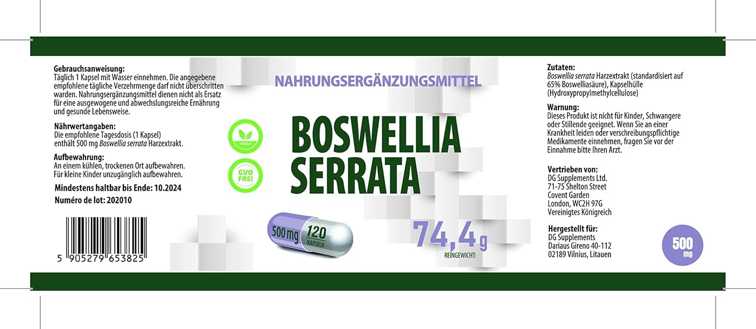 About this item ? High-Strength Boswellia Serrata β 5000mg Equivalent Per Serving β Delivers a potent 500mg of 10:1 Boswellia extract, providing maximum joint and inflammation support. ? Supports Joint Health & Mobility β Helps reduce stiffness, improve flexibility, and promote long-term joint function, making it ideal for active individuals and those with joint discomfort. ? Natural Anti-Inflammatory Properties β Rich in boswellic acids, which support a healthy inflammatory response, aiding in joint and muscle recovery. ? Aids Post-Exercise Recovery & Physical Performance β Supports muscle relaxation, endurance, and post-workout recovery, helping to reduce soreness and fatigue. ? Supports Gut & Digestive Health β Traditionally used to help maintain gut lining integrity and promote digestive wellness. ? 120 Vegan Capsules β 2-Month Supply β A long-lasting, easy-to-swallow supplement, providing consistent daily joint and mobility support. ? No Fillers, No Bulking Agents, No Artificial Additives β A clean and pure formula, free from preservatives, unnecessary fillers, gluten, and GMOs. ? 3rd Party Lab Tested & GMP Certified β Rigorously tested for purity, potency, and safety, ensuring a high-quality Boswellia Serrata supplement you can trust. βΊ See more product details,? High-Strength Boswellia Serrata β 5000mg Equivalent Per Serving β Delivers a potent 500mg of 10:1 Boswellia extract, providing maximum joint and inflammation support,? Supports Joint Health & Mobility β Helps reduce stiffness, improve flexibility, and promote long-term joint function, making it ideal for active individuals and those with joint discomfort,? Natural Anti-Inflammatory Properties β Rich in boswellic acids, which support a healthy inflammatory response, aiding in joint and muscle recovery,? Aids Post-Exercise Recovery & Physical Performance β Supports muscle relaxation, endurance, and post-workout recovery, helping to reduce soreness and fatigue,? Supports Gut & Digestive Health β Traditionally used to help maintain gut lining integrity and promote digestive wellness,? 120 Vegan Capsules β 2-Month Supply β A long-lasting, easy-to-swallow supplement, providing consistent daily joint and mobility support,? No Fillers, No Bulking Agents, No Artificial Additives β A clean and pure formula, free from preservatives, unnecessary fillers, gluten, and GMOs,? 3rd Party Lab Tested & GMP Certified β Rigorously tested for purity, potency, and safety, ensuring a high-quality Boswellia Serrata supplement you can trust