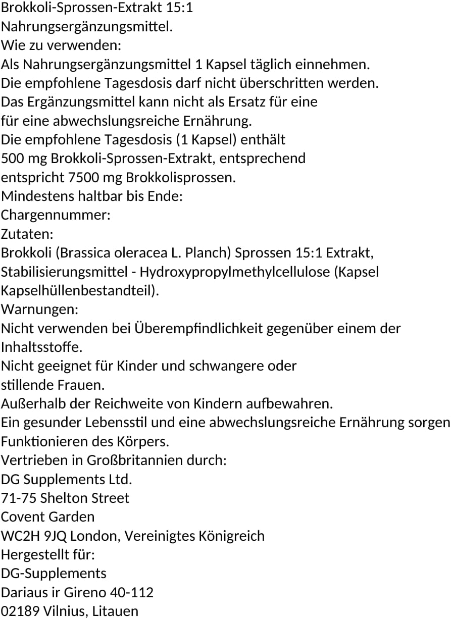 ? HIGH-STRENGTH BROCCOLI SPROUT EXTRACT β Each capsule delivers a 7,500mg equivalent dose, derived from a 15:1 concentrated extract for maximum potency and effectiveness. ? ACTIVATED SULFORAPHANE FOR DETOX SUPPORT β Naturally rich in sulforaphane, a powerful compound that helps support liver function, detox pathways, and cellular protection ? POWERFUL ANTIOXIDANT & CELLULAR DEFENSE β Helps neutralise free radicals, reduce oxidative stress, and support immune health for overall well-being and longevity. ? SUPPORTS LIVER FUNCTION & NATURAL DETOXIFICATION β Assists in flushing out toxins, promoting healthy digestion, metabolism, and internal cleansing. ? 90 VEGAN CAPSULES β 3-MONTH SUPPLY β A once-daily formula provides a full 3-month supply, offering exceptional value and long-lasting benefits. ? 3RD PARTY LAB TESTED FOR PURITY & SAFETY β Independently tested for heavy metals, contaminants, and potency, ensuring a clean, high-quality supplement you can trust. ? 100% NATURAL, VEGAN & NON-GMO β Free from artificial additives, fillers, and preservatives, making it a pure, plant-based choice for those seeking natural health support. ? GMP-CERTIFIED MANUFACTURING β Produced under strict Good Manufacturing Practices (GMP) to guarantee premium quality, safety, and consistency in every capsule. βΊ See more product details,? HIGH-STRENGTH BROCCOLI SPROUT EXTRACT β Each capsule delivers a 7,500mg equivalent dose, derived from a 15:1 concentrated extract for maximum potency and effectiveness,? ACTIVATED SULFORAPHANE FOR DETOX SUPPORT β Naturally rich in sulforaphane, a powerful compound that helps support liver function, detox pathways, and cellular protection,? POWERFUL ANTIOXIDANT & CELLULAR DEFENSE β Helps neutralise free radicals, reduce oxidative stress, and support immune health for overall well-being and longevity,? SUPPORTS LIVER FUNCTION & NATURAL DETOXIFICATION β Assists in flushing out toxins, promoting healthy digestion, metabolism, and internal cleansing,? 90 VEGAN CAPSULES β 3-MONTH SUPPLY β A once-daily formula provides a full 3-month supply, offering exceptional value and long-lasting benefits,? 3RD PARTY LAB TESTED FOR PURITY & SAFETY β Independently tested for heavy metals, contaminants, and potency, ensuring a clean, high-quality supplement you can trust,? 100% NATURAL, VEGAN & NON-GMO β Free from artificial additives, fillers, and preservatives, making it a pure, plant-based choice for those seeking natural health support,? GMP-CERTIFIED MANUFACTURING β Produced under strict Good Manufacturing Practices (GMP) to guarantee premium quality, safety, and consistency in every capsule