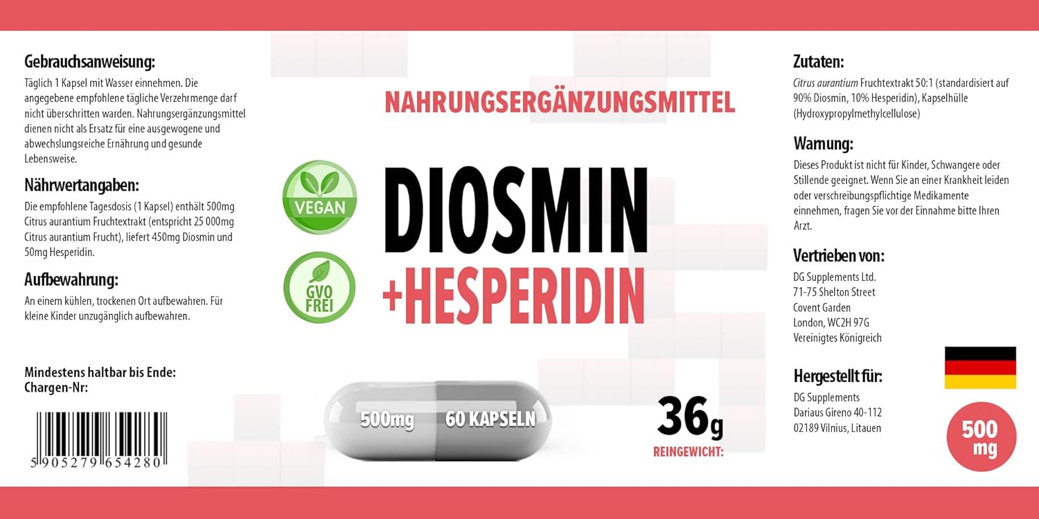 Product description Hepatica Diosmin & Hesperidin β High-Strength Vein & Circulation Support Support healthy veins, circulation, and leg comfort with Diosmin & Hesperidin 500mg, a premium flavonoid complex known for its vascular-protective properties. Diosmin and Hesperidin are naturally derived bioflavonoids that help promote healthy blood flow, reduce swelling, and support vein function, making them ideal for leg health, varicose veins, and overall cardiovascular wellness. Why Choose Our Diosmin & Hesperidin Supplement ? High-Strength 500mg Per Capsule β A powerful blend of Diosmin and Hesperidin for maximum effectiveness. ? Supports Vein & Circulatory Health β Helps maintain strong and healthy veins, reducing discomfort caused by poor circulation. ? Helps Reduce Leg Swelling & Heaviness β May alleviate tired, heavy, and swollen legs, ideal for those who stand or sit for long periods. ? Promotes Cardiovascular Health β Supports healthy blood circulation and vessel elasticity, helping to improve overall vascular function. ? 60 Vegan Capsules β 2-Month Supply β Long-lasting daily support for optimal circulation and vein health. ? No Fillers or Bulkers β Pure Formula β Free from artificial additives, GMOs, gluten, dairy, soy, and preservatives. ? 3rd Party Lab Tested for Purity & Safety β Ensuring quality, potency, and effectiveness in every capsule. ? Manufactured in a GMP-Certified Facility β Produced under strict quality standards for a trusted supplement. The Benefits of Diosmin & Hesperidin ?? Supports Healthy Veins & Leg Comfort β Aids in the reduction of varicose veins, spider veins, and leg discomfort. ?? Promotes Circulatory Function β Enhances blood vessel strength and flexibility for better circulation. ?? Cardiovascular & Vascular Support β Helps maintain healthy arteries and optimal blood flow. ??? Natural Antioxidant Properties β Protects blood vessels from oxidative stress and inflammation. Who Can Benefit ? Individuals experiencing leg swelling, varicose veins, or circulation issues ? Those who stand or sit for long hours and need better blood flow support ? People looking to enhance vascular and cardiovascular health ? Anyone seeking natural vein and artery support Improve Circulation & Vein Health Naturally! Experience the powerful, science-backed benefits of Diosmin & Hesperidinβcrafted for vein strength, circulatory health, and overall well-being. Ingredients Diosmin, hesperidin , stabilizing agent - hydroxypropylmethylcellulose (capsule ingredient) P.when('A').execute(function(A) { A.on('a:expander:toggle_description:toggle:collapse', function(data) { window.scroll(0, data.expander.$expander[0].offsetTop-100); }); }); Directions As a food supplement take 1 vegan capsule daily, preferably with a glass of water. Recommended daily intake (1 capsules) contains Diosmin 450mg, Hesperidin 50mg. Each bottle contains 60 capsules. 2 Month supply Safety Warning Do not exceed the recommended daily portion. The supplements can not be used as a substitute for a diverse diet. Do not use in case of sensitivity to any of the product ingredients. Not suitable for children and pregnant or breastfeeding women. Keep away from the reach of children. See more,HIGH-STRENGTH DIOSMIN & HESPERIDIN β 500MG PER CAPSULE β A potent blend of bioflavonoids known for supporting vein health, circulation, and cardiovascular function,SUPPORTS HEALTHY VEINS & LEG COMFORT β Helps maintain strong veins, reduce varicose veins, and alleviate tired, heavy, and swollen legs,PROMOTES HEALTHY CIRCULATION & BLOOD FLOW β Enhances vascular function, making it ideal for those who stand or sit for long periods,CARDIOVASCULAR & VASCULAR SUPPORT β Supports healthy blood vessels, artery function, and optimal circulation for heart health,60 VEGAN CAPSULES β 2-MONTH SUPPLY β A long-lasting supply providing daily support for improved vein and circulatory health,PURE FORMULA β NO FILLERS OR BULKERS β Free from artificial additives, GMOs, gluten, dairy, soy, and preservatives, ensuring a clean and effective supplement,3RD PARTY LAB TESTED FOR PURITY & SAFETY β Independently tested to ensure high quality, potency, and effectiveness, manufactured in a GMP-certified facility