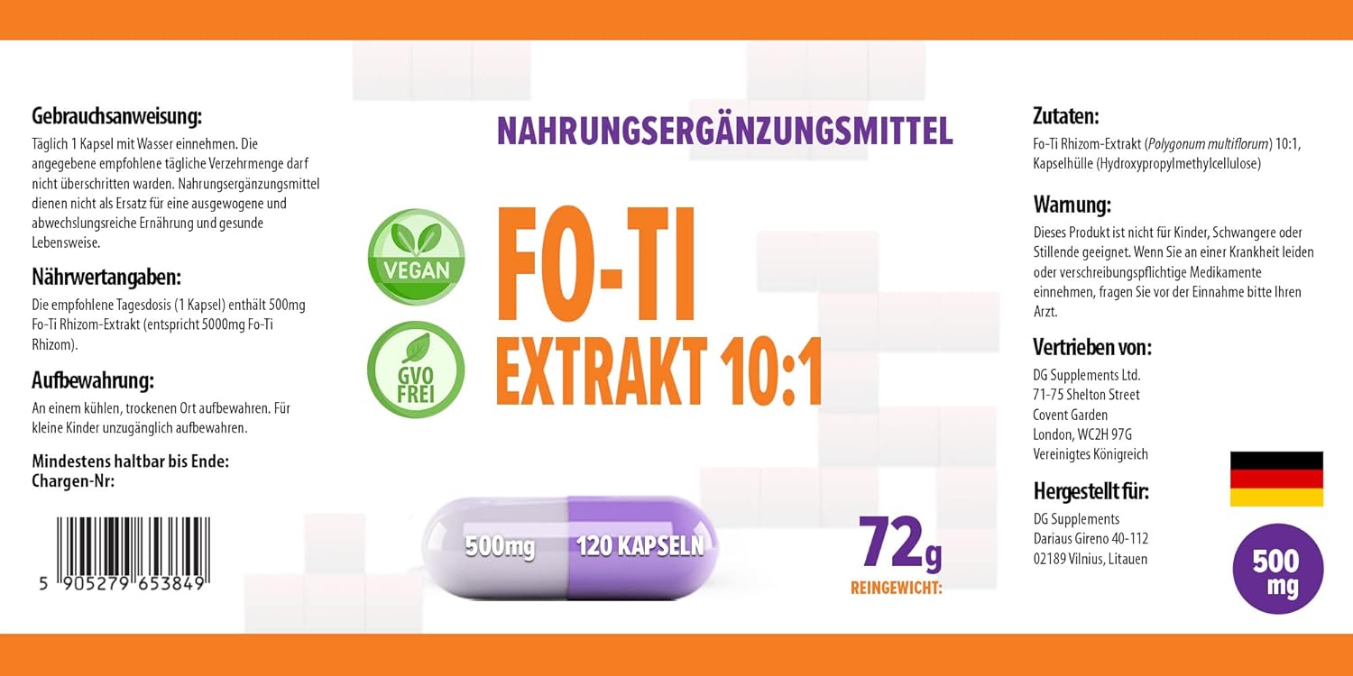 Product description Hepatica Fo-Ti Root (He Shou Wu) Extract 10:1 | 5,000mg Equivalent | 120 Vegan Capsules | High Strength Longevity & Hair Health Support | Certificate of Analysis | No Fillers or Bulkers Ancient Herbal Support for Longevity, Hair Growth & Vitality Fo-Ti Root, also known as He Shou Wu, is a revered herb in Traditional Chinese Medicine (TCM), widely used for its potential to support hair growth, promote vitality, and enhance longevity. This powerful adaptogen is believed to nourish the body, improve energy levels, and maintain youthful health. Our high-strength 10:1 extract (5,000mg equivalent) ensures maximum potency and effectiveness in every capsule. Why Choose Hepatica Fo-Ti Root ? High Strength 10:1 Extract β Provides the equivalent of 5,000mg of pure Fo-Ti root per serving for enhanced benefits. ? Supports Hair Growth & Natural Pigmentation β Traditionally used to help maintain hair thickness, colour, and overall scalp health. ? Promotes Longevity & Vitality β Known as a rejuvenating herb, Fo-Ti is believed to support energy levels, endurance, and anti-aging. ? Enhances Circulation & Cardiovascular Health β May contribute to better blood flow and overall well-being. ? 120 Vegan Capsules β 4-Month Supply β A once-daily formula offering exceptional value and long-lasting support. ? Certified for Purity & Quality β Backed by a Certificate of Analysis to ensure premium-grade extract and authenticity. ? No Fillers, Bulkers, or Artificial Additives β Made with 100% pure Fo-Ti root extract, ensuring clean and effective supplementation. ? Gluten-Free, Non-GMO & Vegan-Friendly β A clean and plant-based formula, suitable for all dietary preferences. ? GMP-Certified Manufacturing β Produced under strict Good Manufacturing Practices (GMP) for consistent quality and safety. The Benefits of Fo-Ti Root (He Shou Wu) Fo-Ti has been widely used in Traditional Chinese Medicine for centuries due to its potential to: ? Support hair growth and prevent premature greying ? Enhance longevity and promote vitality ? Improve energy levels and reduce fatigue ? Aid circulation and cardiovascular health ? Provide adaptogenic support for stress management Pure, Potent & Backed by Tradition Our vegan, gluten-free, and non-GMO Fo-Ti supplement provides a natural and effective way to support hair health, longevity, and overall well-being. Each capsule is free from artificial coatings, preservatives, or unnecessary fillers, ensuring maximum absorption and bioavailability. Rejuvenate Your Body & Hair Naturally Take control of your youthful energy, hair health, and vitality with our high-strength Fo-Ti Root supplement. Add to your cart today and experience the benefits! Ingredients per 1 vegan capsule :Fo-ti Root Extract 10:1 500mg (5000mg equivalent) P.when('A').execute(function(A) { A.on('a:expander:toggle_description:toggle:collapse', function(data) { window.scroll(0, data.expander.$expander[0].offsetTop-100); }); }); Directions As a food supplement take 1 vegan capsule daily, preferably with a glass of water. Recommended daily intake (1 capsule) contains 500mg (5000mg equivalent) Fo-ti Root Extract 10:1 . Each bottle contains 120 capsules. 4 Month supply Safety Warning Do not exceed the recommended daily portion. The supplements can not be used as a substitute for a diverse diet. Do not use in case of sensitivity to any of the product ingredients. Not suitable for children and pregnant or breastfeeding women. Keep away from the reach of children. See more,? HIGH-STRENGTH FO-TI ROOT EXTRACT β Each capsule delivers a 10:1 concentrated extract, equivalent to 5,000mg of pure Fo-Ti root, ensuring maximum potency and effectiveness,? SUPPORTS HAIR GROWTH & NATURAL COLOUR β Traditionally used in Chinese medicine to promote hair growth, reduce hair thinning, and help maintain natural pigmentation,? ENHANCES LONGEVITY & VITALITY β Known as an anti-aging adaptogen, He Shou Wu helps support energy levels, endurance, and youthful well-being,? BOOSTS CIRCULATION & CARDIOVASCULAR HEALTH β May contribute to healthy blood flow, supporting heart health and overall vitality,THE COMPANY IS CERTIFIED as "A" leader in its size category and sector of activities. Manufactured under a strict GMP code of practice,? 120 VEGAN CAPSULES β 4-MONTH SUPPLY β A once-daily formula provides a full 4-month supply, offering exceptional value and long-lasting benefits,? CERTIFIED FOR PURITY & AUTHENTICITY β Backed by a Certificate of Analysis, ensuring premium quality, purity, and potency,? NO FILLERS, BULKERS, OR ARTIFICIAL ADDITIVES β Made with 100% pure Fo-Ti root extract, free from unnecessary ingredients, ensuring better absorption and effectiveness,? GLUTEN-FREE, NON-GMO & VEGAN-FRIENDLY β Formulated with 100% plant-based ingredients, suitable for all dietary needs,? GMP-CERTIFIED MANUFACTURING β Produced under strict Good Manufacturing Practices (GMP) to guarantee premium quality, safety, and consistency in every capsule