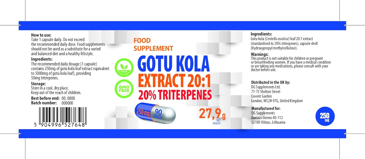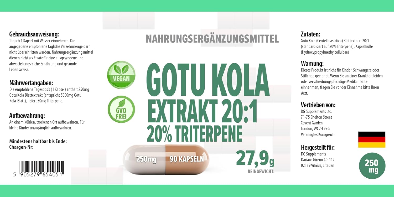 Product description Gotu Kola 5,000mg | 20:1 Extract (250mg) | 90 Vegan Capsules | 20% Triterpenes | High Strength Brain & Memory Support Supplement | 3rd Party Lab Tested Boost Your Brain & Body with Premium Gotu Kola Extract Harness the power of Gotu Kola, a time-tested herbal supplement known for its cognitive and circulatory benefits. Our high-strength 5,000mg equivalent formula delivers 20:1 extract (250mg per serving) with 20% triterpenes, ensuring optimal potency and effectiveness. Why Choose Our Gotu Kola Maximum Strength Formula β High-potency 20:1 extract for superior absorption Supports Brain Function & Memory β Traditionally used for cognitive clarity and focus Promotes Healthy Circulation β May aid blood flow, skin health, and overall vitality 90 Vegan Capsules β 3-month supply for long-lasting benefits 3rd Party Lab Tested β Guaranteed purity, potency, and safety 100% Natural & Non-GMO β No fillers, artificial additives, or preservatives What is Gotu Kola Gotu Kola (Centella Asiatica) is an ancient herb used in Ayurvedic and traditional Chinese medicine for its powerful nootropic and adaptogenic properties. Itβs commonly taken to enhance brain function, reduce mental fatigue, and support overall wellness. Pure, Potent & Vegan-Friendly Our vegan-friendly, gluten-free, and non-GMO capsules provide a clean and effective way to enjoy Gotu Kolaβs benefits. Each batch is 3rd-party lab tested for safety and quality assurance. Take Charge of Your Mental Clarity & Well-Being! Experience the natural power of Gotu Kola extract and elevate your focus, memory, and overall health. Add to your cart today! Ingredients Gotu kola (Centella asiatica) leaf 20:1 extract (standardised to 20% triterpenes), capsule shell (Hydroxypropyl methylcellulose). P.when('A').execute(function(A) { A.on('a:expander:toggle_description:toggle:collapse', function(data) { window.scroll(0, data.expander.$expander[0].offsetTop-100); }); }); Directions As a food supplement take 1 vegan capsule daily, preferably with a glass of water. 1 capsule: contains 250mg of gotu kola leaf extract equivalent to 5000mg of gotu kola leaf), providing . Each bottle contains 90 capsules. 3 Month supply Safety Warning Do not exceed the recommended daily portion. The supplements can not be used as a substitute for a diverse diet. Do not use in case of sensitivity to any of the product ingredients. Not suitable for children and pregnant or breastfeeding women. Keep away from the reach of children. See more,MAXIMUM STRENGTH GOTU KOLA β Our high-potency 5,000mg equivalent formula features a 20:1 extract (250mg per serving) with 20% triterpenes, ensuring superior absorption and effectiveness,BRAIN FUNCTION & MEMORY SUPPORT β Traditionally used in Ayurvedic & Chinese medicine, Gotu Kola is known for its nootropic properties, promoting mental clarity, focus, and cognitive health,PROMOTES HEALTHY CIRCULATION β Gotu Kola may support blood flow, contributing to better skin health, enhanced vitality, and overall wellness,90 VEGAN CAPSULES β 3-MONTH SUPPLY β Each bottle provides a full 3-month supply with just one capsule per day, making it a cost-effective and convenient choice for daily use,3RD-PARTY LAB TESTED FOR PURITY & SAFETY β Independently tested for heavy metals, molds, and contaminants, ensuring the highest quality and safety standards,100% NATURAL, NON-GMO & VEGAN-FRIENDLY β Made with no artificial additives, fillers, or preservatives, our Gotu Kola capsules are gluten-free, non-GMO, and vegan-friendly