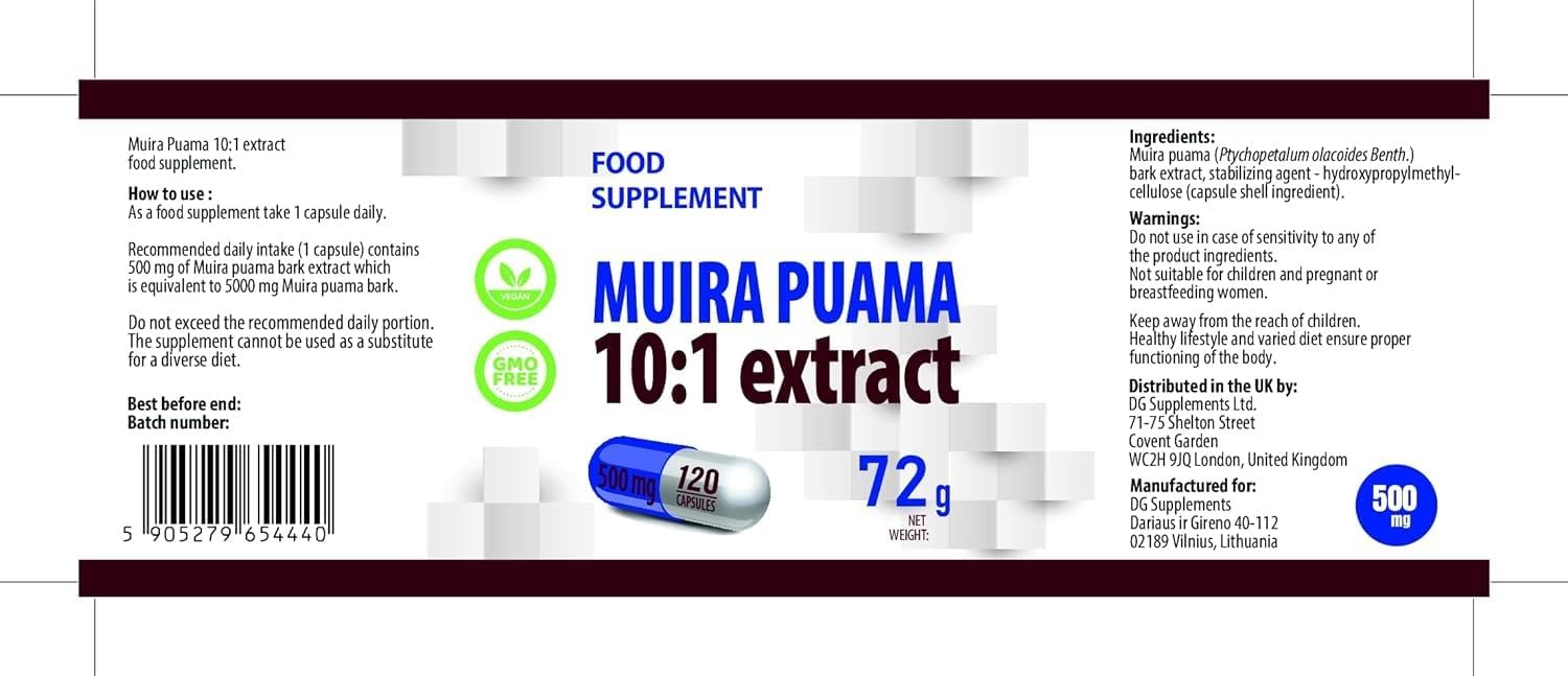 About The Product : HIGH-STRENGTH MUIRA PUAMA EXTRACT 5000MG β Each capsule delivers a 5000mg equivalent dose, derived from a 10:1 concentrated extract (500mg per serving) for maximum potency and effectiveness