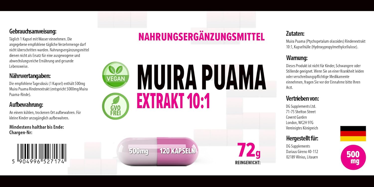 About this item HIGH-STRENGTH MUIRA PUAMA EXTRACT 5000MG β Each capsule delivers a 5000mg equivalent dose, derived from a 10:1 concentrated extract (500mg per serving) for maximum potency and effectiveness. BOOSTS ENERGY & STAMINA NATURALLY β Traditionally used to combat fatigue, increase endurance, and support vitality, making it ideal for athletes, active individuals, and daily energy support. SUPPORTS LIBIDO & SEXUAL HEALTH β Known as "Potency Wood," Muira Puama is widely used to enhance libido and sexual performance in both men and women. IMPROVES COGNITIVE FUNCTION & MENTAL CLARITY β May help reduce brain fog, support memory retention, and improve focus, making it beneficial for students, professionals, and those looking to stay sharp. PROMOTES STRESS RESILIENCE & MOOD BALANCE β As a natural adaptogen, Muira Puama helps the body manage stress, improve relaxation, and support emotional well-being. 120 VEGAN CAPSULES β 4-MONTH SUPPLY β A once-daily formula provides a full 4-month supply, offering exceptional value and long-term benefits. 3RD PARTY LAB TESTED FOR PURITY & SAFETY β Independently tested for heavy metals, contaminants, and potency, ensuring a clean, high-quality supplement you can trust. 100% NATURAL, VEGAN & NON-GMO β Free from artificial additives, fillers, gluten, dairy, and preservatives, making it a pure, plant-based choice for vitality and energy support. GMP-CERTIFIED MANUFACTURING β Produced under strict Good Manufacturing Practices (GMP) to guarantee premium quality, safety, and consistency in every capsule,HIGH-STRENGTH MUIRA PUAMA EXTRACT 5000MG β Each capsule delivers a 5000mg equivalent dose, derived from a 10:1 concentrated extract (500mg per serving) for maximum potency and effectiveness,BOOSTS ENERGY & STAMINA NATURALLY β Traditionally used to combat fatigue, increase endurance, and support vitality, making it ideal for athletes, active individuals, and daily energy support,SUPPORTS LIBIDO & SEXUAL HEALTH β Known as "Potency Wood," Muira Puama is widely used to enhance libido and sexual performance in both men and women,IMPROVES COGNITIVE FUNCTION & MENTAL CLARITY β May help reduce brain fog, support memory retention, and improve focus, making it beneficial for students, professionals, and those looking to stay sharp,PROMOTES STRESS RESILIENCE & MOOD BALANCE β As a natural adaptogen, Muira Puama helps the body manage stress, improve relaxation, and support emotional well-being,120 VEGAN CAPSULES β 4-MONTH SUPPLY β A once-daily formula provides a full 4-month supply, offering exceptional value and long-term benefits,3RD PARTY LAB TESTED FOR PURITY & SAFETY β Independently tested for heavy metals, contaminants, and potency, ensuring a clean, high-quality supplement you can trust,100% NATURAL, VEGAN & NON-GMO β Free from artificial additives, fillers, gluten, dairy, and preservatives, making it a pure, plant-based choice for vitality and energy support,GMP-CERTIFIED MANUFACTURING β Produced under strict Good Manufacturing Practices (GMP) to guarantee premium quality, safety, and consistency in every capsule