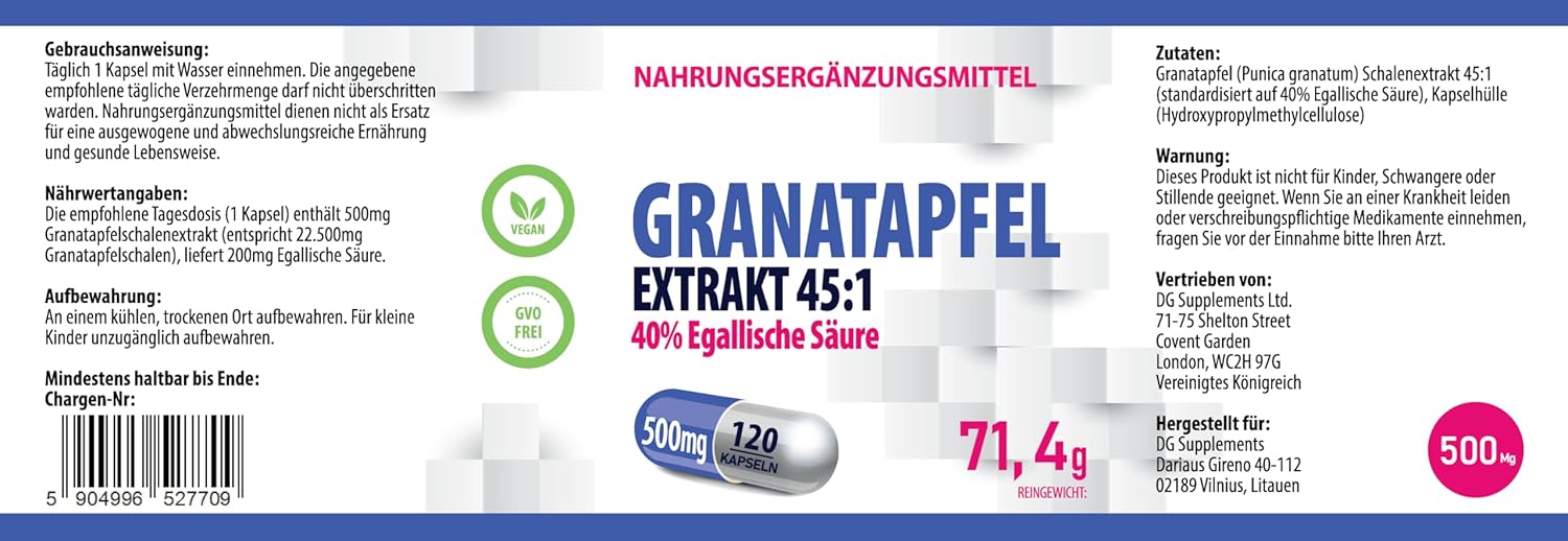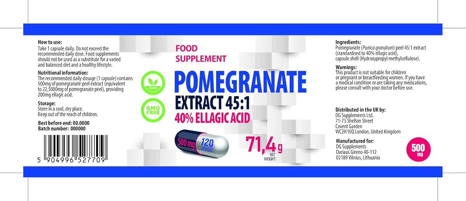 Product description Hepatica Pomegranate Extract 22,500mg Equivalent (500mg of 45:1 Extract) 120 Vegan Capsules, 40% Ellagic Acid, 3rd Party Lab Tested, High Strength Supplement Ingredients Pomegranate (Punica granatum) peel 45:1 extract (standardised to 40% ellagic acid), capsule shell (Hydroxypropyl methylcellulose),? High Strength 45:1 Pomegranate Extract β Delivers 500mg of concentrated extract, equivalent to 22,500mg of raw pomegranate, for maximum potency,? Rich in Ellagic Acid (40%) β Contains a high concentration of ellagic acid, a powerful antioxidant known for its cellular protection and anti-ageing benefits,? Powerful Antioxidant Support β Helps immune function, and overall well-being,? Enhances Skin & Cellular Health β The high ellagic acid content may contribute to skin elasticity, collagen production, and overall cellular regeneration,? 4-Month Supply β 120 easy-to-swallow capsules, just one capsule per day for sustained antioxidant and heart health support,? 100% Vegan & Free from Additives β No artificial colours, preservatives, gluten, dairy, or GMOs, making it suitable for all dietary needs,? 3rd Party Lab Tested & GMP Certified β Independently tested for purity, potency, and safety, ensuring premium quality and effectiveness