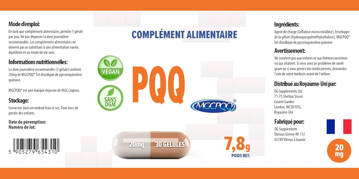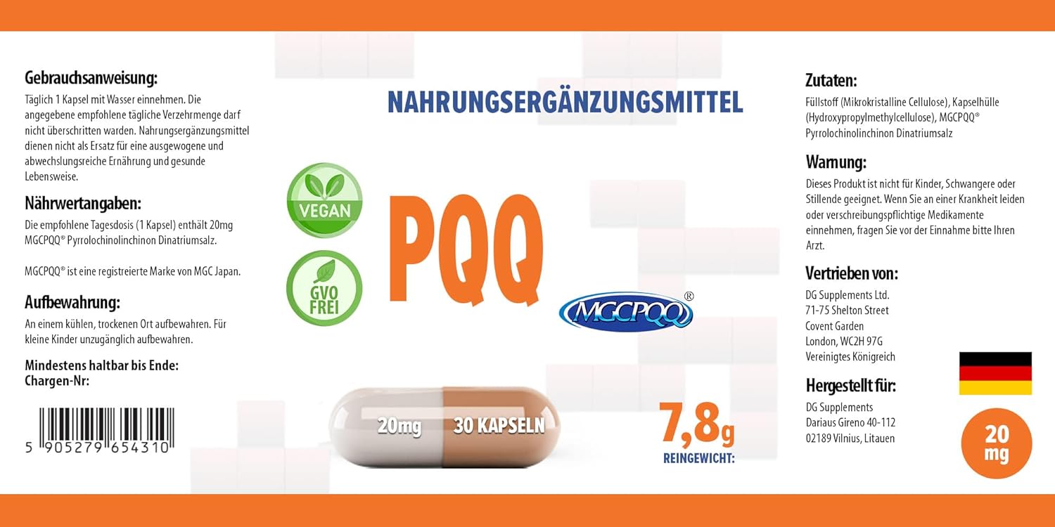 HIGH-STRENGTH PQQ β 20MG PER CAPSULE β Each serving provides a potent 20mg dose of Pyrroloquinoline Quinone (MGCPQQ) to support brain function, energy production, and cellular repair. BOOSTS ENERGY & CELLULAR HEALTH β PQQ helps stimulate the growth of new mitochondria, improving cellular energy, stamina, and overall vitality. SUPPORTS COGNITIVE FUNCTION & MEMORY β A powerful nootropic that enhances mental clarity, focus, learning, and memory retention. CARDIOVASCULAR & LONGEVITY SUPPORT β PQQ is a potent antioxidant that helps protect against oxidative stress. THE COMPANY IS CERTIFIED as "A" leader in its size category and sector of activities. Manufactured under a strict GMP code of practice 30 VEGAN CAPSULES β 1-MONTH SUPPLY β A convenient, high-potency supplement designed for daily brain and energy support. CERTIFIED, GLUTEN-FREE & NON-GMO β Free from artificial additives, fillers, preservatives, dairy, and soy, ensuring a pure and clean supplement. 3RD PARTY LAB TESTED FOR PURITY & SAFETY β Independently tested to ensure quality and potency, manufactured in a GMP-certified facility. βΊ See more product details,HIGH-STRENGTH PQQ β 20MG PER CAPSULE β Each serving provides a potent 20mg dose of Pyrroloquinoline Quinone (MGCPQQ) to support brain function, energy production, and cellular repair,BOOSTS ENERGY & CELLULAR HEALTH β PQQ helps stimulate the growth of new mitochondria, improving cellular energy, stamina, and overall vitality,SUPPORTS COGNITIVE FUNCTION & MEMORY β A powerful nootropic that enhances mental clarity, focus, learning, and memory retention,CARDIOVASCULAR & LONGEVITY SUPPORT β PQQ is a potent antioxidant that helps protect against oxidative stress,THE COMPANY IS CERTIFIED as "A" leader in its size category and sector of activities. Manufactured under a strict GMP code of practice,30 VEGAN CAPSULES β 1-MONTH SUPPLY β A convenient, high-potency supplement designed for daily brain and energy support,CERTIFIED, GLUTEN-FREE & NON-GMO β Free from artificial additives, fillers, preservatives, dairy, and soy, ensuring a pure and clean supplement,3RD PARTY LAB TESTED FOR PURITY & SAFETY β Independently tested to ensure quality and potency, manufactured in a GMP-certified facility
