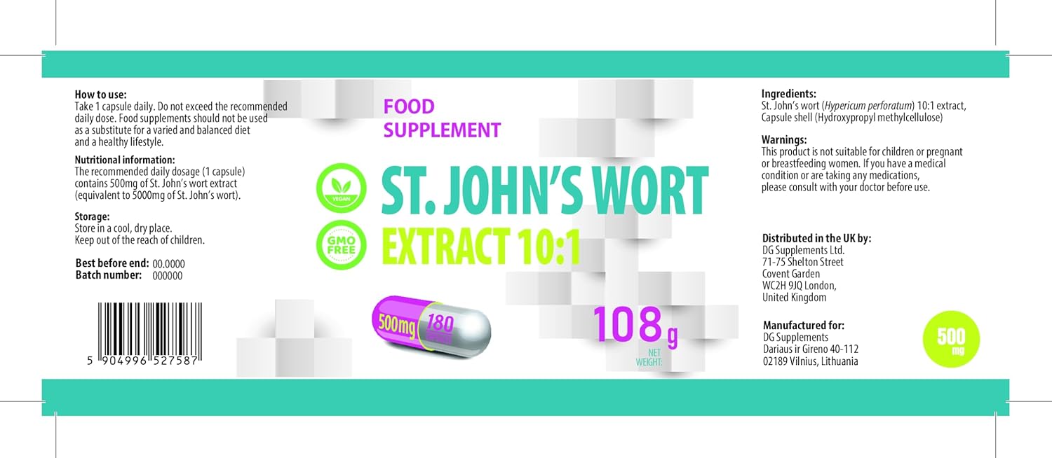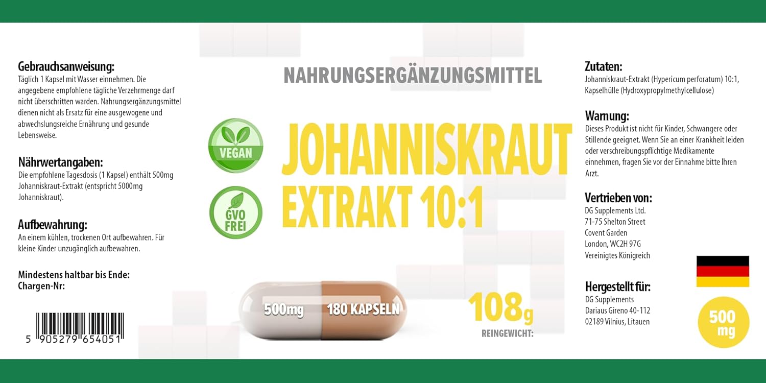 Product description St. John’s Wort 5,000mg | 10:1 Extract (500mg) | 180 Vegan Capsules | High Strength Mood & Emotional Well-Being Support | 3rd Party Lab Tested Support Your Mood & Emotional Well-Being Naturally St. John’s Wort has been traditionally used for centuries to support mood balance, emotional well-being, and overall mental clarity. Our high-strength 5,000mg equivalent formula is derived from a concentrated 10:1 extract (500mg per serving) to provide maximum potency and effectiveness. Why Choose Our St. John’s Wort Supplement ? Ultra High-Strength 10:1 Extract – Delivers an equivalent of 5,000mg St. John’s Wort per serving for optimal support ? Mood & Emotional Balance – Traditionally used to promote positive mood, relaxation, and mental clarity ? 180 Vegan Capsules – 6-Month Supply – A once-daily formula for long-lasting benefits and great value ? 3rd Party Lab Tested for Purity & Safety – Independently tested for heavy metals, contaminants, and potency ? 100% Natural, Vegan & Non-GMO – Free from artificial additives, fillers, and preservatives ? GMP-Certified Manufacturing – Produced under strict Good Manufacturing Practices (GMP) for premium quality and consistency The Power of St. John’s Wort St. John’s Wort (Hypericum perforatum) is a well-known herbal remedy commonly used to support emotional well-being and mental relaxation. It contains active compounds like hypericin and hyperforin, which are believed to contribute to its mood-enhancing properties. Pure, Potent & Plant-Based Formula Our vegan, gluten-free, and non-GMO supplement provides a clean and effective way to naturally support mood balance. Each capsule is free from artificial coatings or preservatives, preserving the integrity and potency of St. John’s Wort for better absorption and results. Feel Calm, Balanced & Focused Take control of your mood, mental well-being, and relaxation with our high-strength St. John’s Wort supplement. Add to your cart today and feel the difference! Ingredients St. John's wort (Hypericum Perforatum) 10:1 extract, Capsule shell (Hydroxypropyl methylcellulose) P.when('A').execute(function(A) { A.on('a:expander:toggle_description:toggle:collapse', function(data) { window.scroll(0, data.expander.$expander[0].offsetTop-100); }); }); Directions As a food supplement take 1 vegan capsule daily, preferably with a glass of water. The recommended daily dosage (1 capsule) contains 500mg St John's Wort extract (equivalent to 5,000 mg of St John's Wort). Each bottle contains 180 capsules. 6 Month supply Safety Warning Do not exceed the recommended daily portion. The supplements can not be used as a substitute for a diverse diet. Do not use in case of sensitivity to any of the product ingredients. Not suitable for children and pregnant or breastfeeding women. Keep away from the reach of children. See more,? HIGH-STRENGTH ST. JOHN’S WORT EXTRACT – Each capsule delivers a 5,000mg equivalent dose, derived from a concentrated 10:1 extract (500mg per serving) for maximum potency and effectiveness,? SUPPORTS MOOD & EMOTIONAL WELL-BEING – Traditionally used to promote a positive mood, relaxation, and mental clarity, helping you feel more balanced and focused,? 180 VEGAN CAPSULES – 6-MONTH SUPPLY – A once-daily formula provides a full 6-month supply, offering exceptional value and long-lasting benefits,? 3RD PARTY LAB TESTED FOR PURITY & SAFETY – Independently tested for heavy metals, contaminants, and potency, ensuring a clean, high-quality supplement you can trust,? 100% NATURAL, VEGAN & NON-GMO – Free from artificial additives, fillers, and preservatives, making it a pure, plant-based choice for those seeking natural mood support,? GMP-CERTIFIED MANUFACTURING – Produced under strict Good Manufacturing Practices (GMP) to guarantee premium quality, safety, and consistency in every capsule