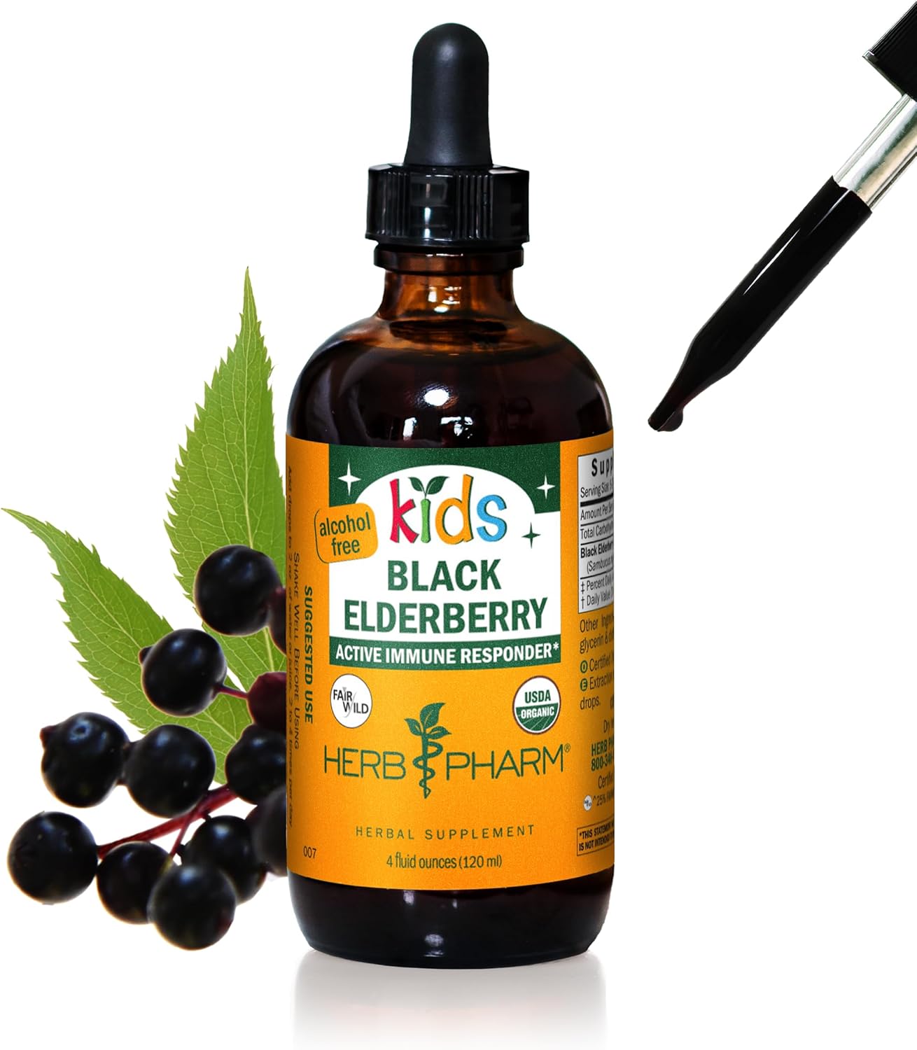 Herb Pharm Alcohol-Free Kids Black Elderberry Liquid Extract supports healthy function of childrenās immune systems. Herb Pharm prepares Kids Black Elderberry from the fully-ripened berries of certified organic Sambucus nigra trees. To ensure a rich spectrum of bioactive compounds, the berries are hand-harvested only when fully mature, are carefully shade-dried to retain their full color & aroma, and are then thoroughly extracted. Easy-to-follow dosing instructions based on body weight are included; simply add drops to a small amount of water or juice. The experts at Herb Pharm select only those herbs that time and experience have proven safe and effective for children. Herb Pharm Alcohol-Free Kids Black Elderberry Liquid Extract, like all Herb Pharm Kidsā herbs, is recommended by Aviva Romm, MD, an internationally-respected expert in botanical and integrative medicine for women and children,Alcohol-Free Kids Black Elderberry Liquid Extract supports healthy function of childrenās immune systems,Prepared from the fully-ripened berries of certified organic Sambucus nigra trees,To ensure a rich spectrum of bioactive compounds, mature berries are hand-harvested, carefully shade-dried, and are then thoroughly extracted,Includes easy-to-follow dosing instructions based on body weight; simply add drops to a small amount of water or juice,COMMITTED TO QUALITY: We sell ~4 million herbalist-crafted products annually and have been in business for 45+ years! Weāre also the worldās 1st Regenerative Organic Certified herb farm