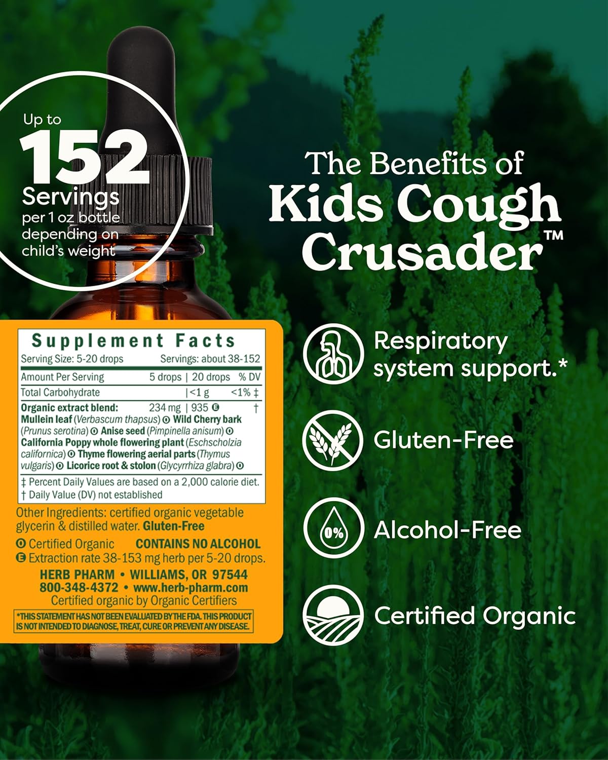 Herb Pharm Kids Certified-Organic Alcohol-Free Cough Crusader Herbal Formula, 1 Ounce,Kids Alcohol-Free Cough Crusader Herbal Formula effectively quiets a child's persistent cough,Cough Crusader is a tasty blend of Wild Cherry, Mullein and other certified organic herbal extracts,Herbs are tested for purity and potency and then individually extracted prior to blending to deliver a broad spectrum of therapeutic plant compounds,Includes easy-to-follow dosing instructions based on body weight; simply add drops to a small amount of water or juice,COMMITTED TO QUALITY: We sell ~4 million herbalist-crafted products annually and have been in business for 45+ years! Weāre also the worldās 1st Regenerative Organic Certified herb farm