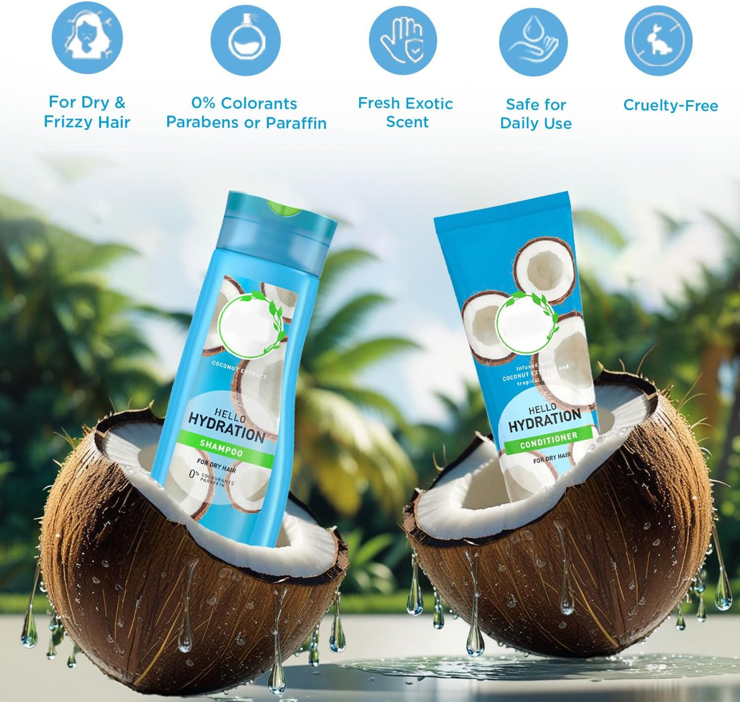 About this item Deep Hydration for Dry Hair – Intensely moisturises and helps repair dry, damaged hair, restoring vital hydration to revive brittle strands and leave your locks softer, smoother, and healthier-looking Coconut-Infused Shampoo & Conditioner – This coconut-infused shampoo and moisturising conditioner duo nourishes each strand with a burst of tropical hydration, drenching dry hair in creamy moisture and leaving behind a lush coconut scent Restores Softness & Shine – Replenishes moisture from root to tip, transforming dull, brittle hair into hair that feels irresistibly soft and smooth, with a radiant healthy shine Gentle, Cruelty-Free Formula – A pH-balanced, colour-safe formula containing no parabens or mineral oil. Plus, Herbal Essence offers a cruelty-free hair care experience so you can nourish your hair with peace of mind Complete Hydrating Duo – Hello Hydration’s shampoo and conditioner work together as a two-step system to cleanse and quench your hair. Use this set for an invigorating, refreshing wash that maximises moisture and leaves your hair revitalized › See more product details,Deep Hydration for Dry Hair – Intensely moisturises and helps repair dry, damaged hair, restoring vital hydration to revive brittle strands and leave your locks softer, smoother, and healthier-looking,Coconut-Infused Shampoo & Conditioner – This coconut-infused shampoo and moisturising conditioner duo nourishes each strand with a burst of tropical hydration, drenching dry hair in creamy moisture and leaving behind a lush coconut scent,Restores Softness & Shine – Replenishes moisture from root to tip, transforming dull, brittle hair into hair that feels irresistibly soft and smooth, with a radiant healthy shine,Gentle, Cruelty-Free Formula – A pH-balanced, colour-safe formula containing no parabens or mineral oil. Plus, Herbal Essence offers a cruelty-free hair care experience so you can nourish your hair with peace of mind,Complete Hydrating Duo – Hello Hydration’s shampoo and conditioner work together as a two-step system to cleanse and quench your hair. Use this set for an invigorating, refreshing wash that maximises moisture and leaves your hair revitalized
