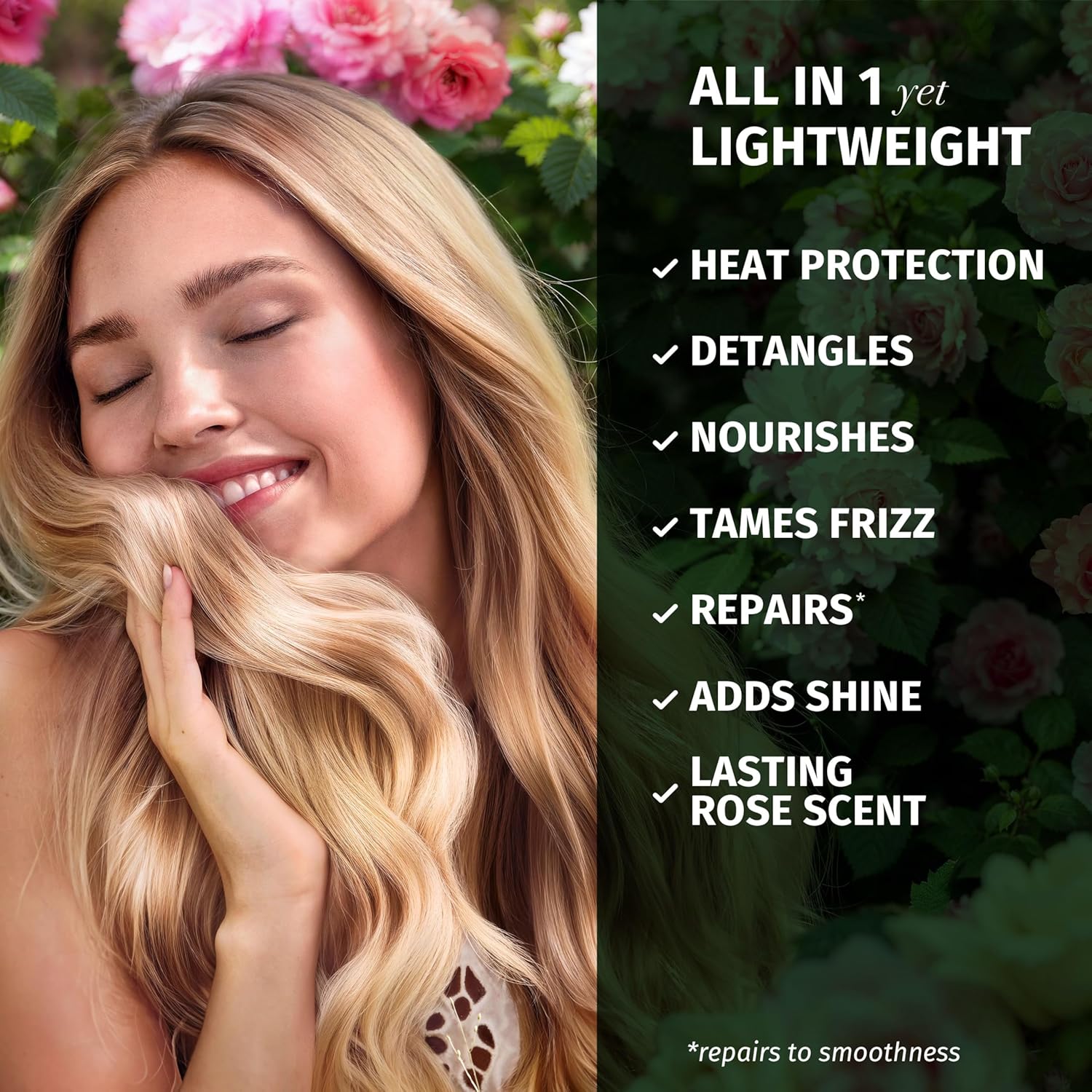 LIGHTWEIGHT FORMULA YET ALL IN 1. Our All in One formula detangles, nourishes, tames frizz, repairs, heat protects, adds shine & lasting scent to your hair