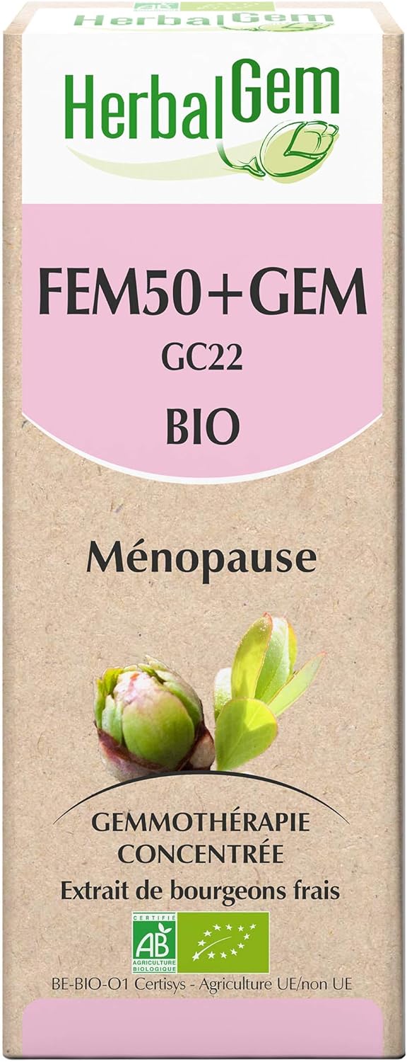 Product Description Formulated with bud maceras and young shoots, the FEM50+GEM complex accompanies the woman over 50 years of age during her menopause. Apple and lingonberry act on the hormonal component. Hawthorn soothes in case of disturbed sleep. The mother tincture of sage will play a regulatory role of night sweats and essential oil of carrot participates in a better hormonal balance thanks to its liver action. Ingredients Pour 15 gouttes : Glycérine végétale* (E422), Alcool* (35% vol.), Eau, Macérats glycérinés de : Jeunes feuilles d'airelles* (Vaccinum vitis idaea L.) - 41 mg**, Bourgeons de pommier* (Malus sylvestris L. Mill.) - 25 mg**, Jeunes pousses de ronce* (Rubus fructicosus L), Bourgeons d'aubépine* (Crataegus oxyacantha L.) - 14 mg**; Teinture mÚre de sauge* (Salvia officinalis L.) - 34 mg**. *Ingrédients issus de l'Agriculture Biologique. **Quantité de plante mise en uvre lors de la fabrication,Alleviates the inconvenience of menopause,5 to 15 drops per day,Do not use in pregnant women,Based on young lingonberry and bramble shoots, hawthorn and apple buds, mother tincture of sage and essential oil of carrot seeds - organic,Not recommended for hormone-dependent cancers