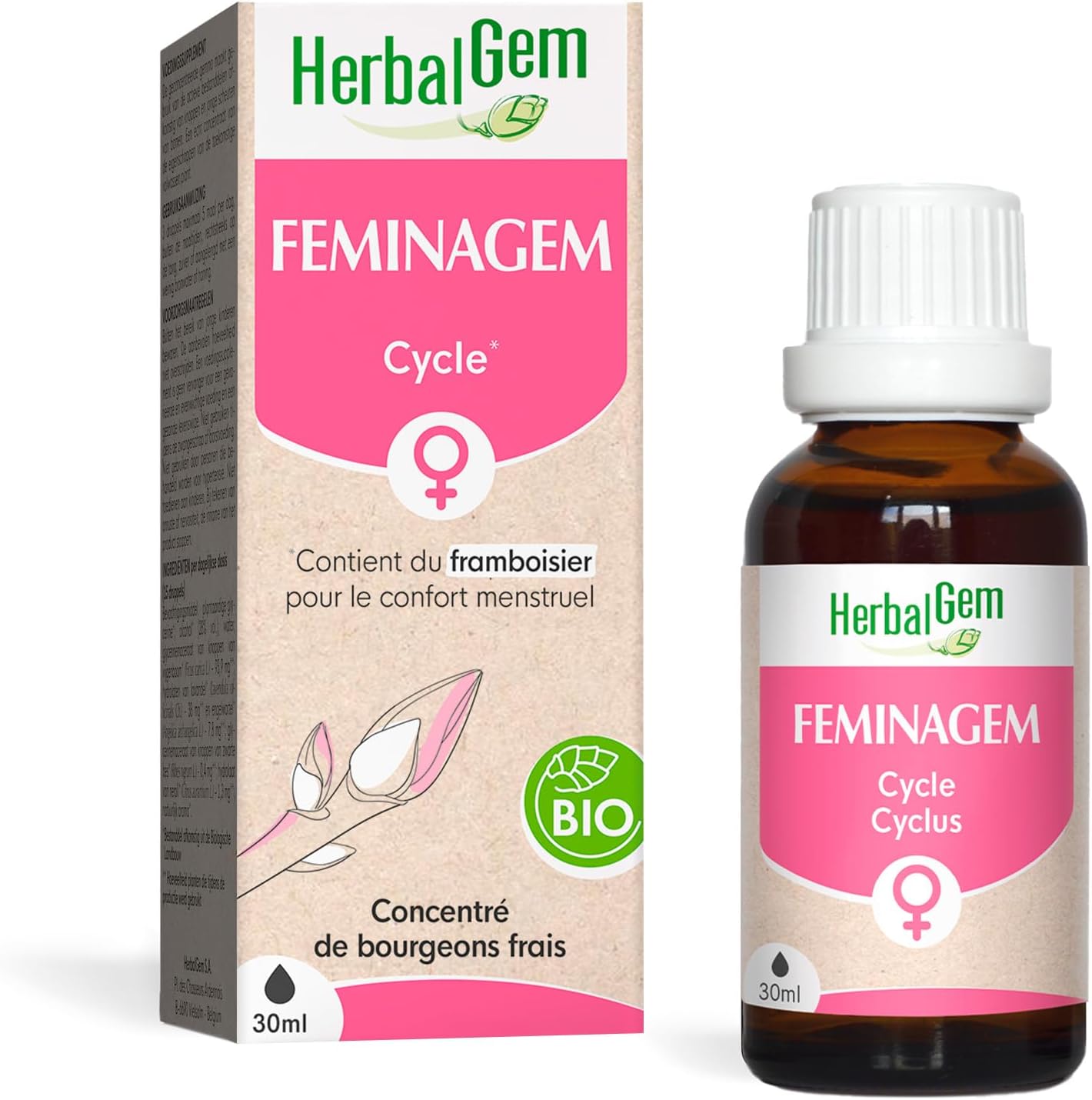 Product Description Feminagem improves the comfort of the woman during her cycle. Young raspberry shoots help regulate the flow thanks to their action on the hormonal balance. The synergistic combination of viburnum, vine and basil gently acts on abdominal discomforts related to menstruation. Marjoram and chamomile promote mood balance. Ingredients Alcool* (40% vol.), Glycérine végétale*, Eau ; Macérat glycériné de jeunes pousses de framboisier* (Rubus idaeus L.) ; Teinture mÚre de camomille* (Chamaemelum nobile L.) ; Macérat glycériné de bourgeons de vigne* (Vitis vinifera L.) ; Teintures mÚres de marjolaine* (Origanum majorana L.) et de viorne* (Viburnum opulus L.) ; Macérat glycériné de bourgeons de viorne* (Viburnum lantana L.) ; Huile essentielle de fenouil* (Fniculum vulgare). *Ingrédient issu de l'Agriculture Biologique. Composition pour 25 gouttes Macérat glycériné de jeunes pousses de framboisier* (Rubus idaeus L.) 69 mg Teinture mÚre de camomille* (Chamaemelum nobile L.) 116 mg Macérat glycériné de bourgeons de vigne* (Vitis vinifera L.) 30 mg Teinture mÚre de marjolaine* (Origanum majorana L.) 38 mg Teinture mÚre de viorne* (Viburnum opulus L.) 55 mg Macérat glycériné de bourgeons de viorne* (Viburnum lantana L.) 9 mg Huile essentielle de fenouil* (Fniculum vulgare) 6 mg,Promotes menstrual comfort,10 to 25 drops per day,In two steps away from meals 3-4 days before the prescribed date of the menstrual and the first days of the menstrual period,Suitable for children aged 13 years and above. Not for use by pregnant women,Made from young raspberry shoots, viorn buds, vine, chamomile mother dyes, marjoram, viorn bark and exotic basil essential oil - organic