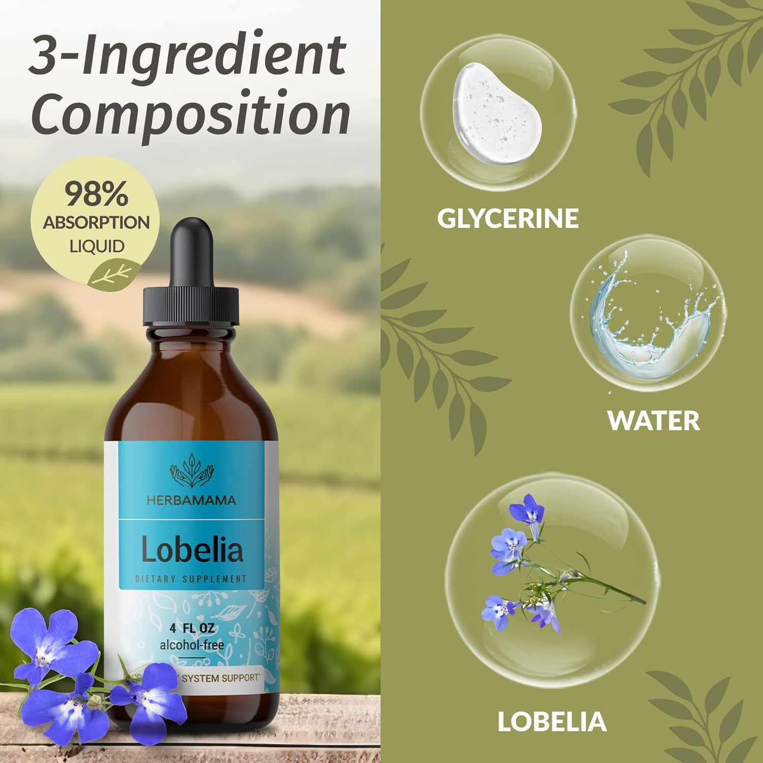 About this item Lung Cleanse: Each drop of Herbamama's herbal Lobelia tincture is carefully crafted for your respiratory system. Our lung support supplement provides lung detox and cleanseing. Only Three Ingredients: Herbamama respiratory tincture features a simple formula with just three ingredients - Lobelia leaf extract, vegetable glycerin, and distilled water. Made vegetarian, with an easy-to-digest formula and no artificial additives. Fast Absorption: Our Lobelia herb respiratory lung support drops formula provides up to a 98% absorption in just two-five minutes. These quickly absorbed lung drops deliver the natural properties of Lobelia inflata herb. For a Variety of Lifestyles: Herbamama vegan formula is based on vegetable glycerin and contains no alcohol or sugar. Our Lobelia leaf tincture is gluten-free and non-GMO. This liquid Lobelia drops are crafted to complement any lifestyle. Shake Well Before Use: Add one squeeze of the dropper bulb to a glass of water or juice, three times daily. You can drop Herbamama Lobelia lung supplements directly onto your tongue, but avoid contact between the dropper and your mouth. See more product details,Lung Cleanse: Each drop of Herbamama's herbal Lobelia tincture is carefully crafted for your respiratory system. Our lung support supplement provides lung detox and cleanseing,Only Three Ingredients: Herbamama respiratory tincture features a simple formula with just three ingredients - Lobelia leaf extract, vegetable glycerin, and distilled water. Made vegetarian, with an easy-to-digest formula and no artificial additives,Fast Absorption: Our Lobelia herb respiratory lung support drops formula provides up to a 98% absorption in just two-five minutes. These quickly absorbed lung drops deliver the natural properties of Lobelia inflata herb,For a Variety of Lifestyles: Herbamama vegan formula is based on vegetable glycerin and contains no alcohol or sugar. Our Lobelia leaf tincture is gluten-free and non-GMO. This liquid Lobelia drops are crafted to complement any lifestyle,Shake Well Before Use: Add one squeeze of the dropper bulb to a glass of water or juice, three times daily. You can drop Herbamama Lobelia lung supplements directly onto your tongue, but avoid contact between the dropper and your mouth