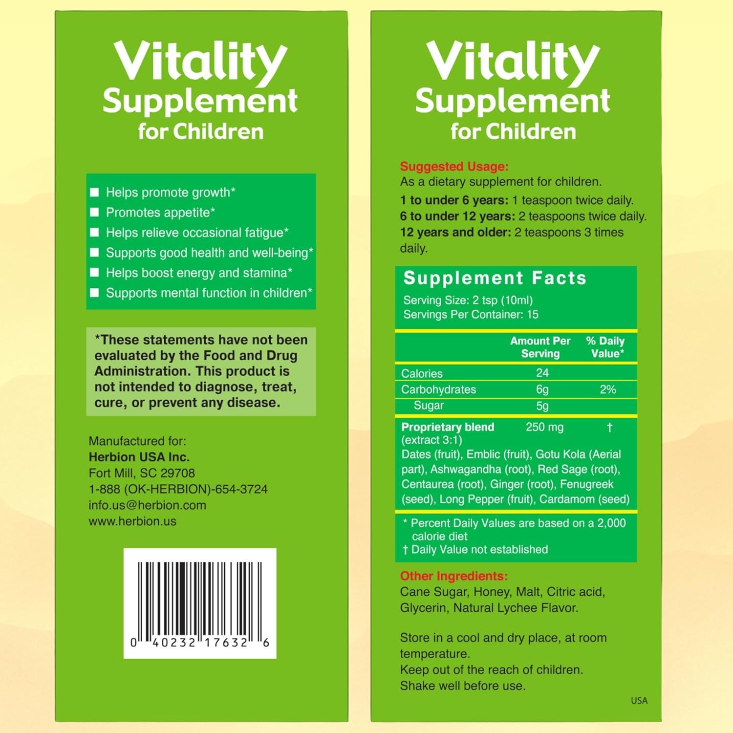 NATURALLY BOOSTS GROWTH: Herbion Vitality Supplement for Children is a unique dietary supplement with Ginger and Fenugreek that helps children grow tall and strong10INCREASES APPETITE: Whether you have a picky eater at hand or a kid with little appetite, Vitality Supplement is the only solution you need. This palatable tummy-friendly syrup restores childrenās appetite like no other10IMPROVES COGNITIVE DEVELOPMENT: Gotu Kola and Withania in the syrup promote memory and ability to perform tasks with ease, which helps ace at school and everyday activities10KID-FRIENDLY FORMULA: Made with wholesome ingredients, Vitality Supplement contains Dates, Emblic, Withania, Gotu Kola, Fenugreek, Ginger, Centaurea, Cardamom, Dried Catkins and Natural flavors10STRONG IMMUNITY: Cardamom and Withania in the syrup bolster the immune system for good health and all year-round well-being of little ones 1 year and above10Herbion Vitality Supplement for Children is made with love for the betterment of kids 1 year and above. Formulated with all-natural ingredients, this supplement works effectively to promote growth, appetite, and relieve occasional fatigue. It also boosts energy, stamina, supports mental functions, and optimizes immune system for the overall good health of your little angels. The kid-friendly formula tastes palatable and can be easily mixed with juices, smoothies and fruit salads10