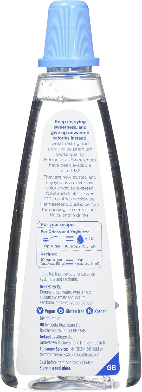 Ingredients Demineralised Water Sweeteners: Sodium Cyclamate (E 952) and Sodium Saccharin (E 954) Preservative: Sorbic Acid (E200) Directions Ideal for hot and cold drinks, for cooking, baking and all low calorie desserts. Usage Guide: For your recipes: One teaspoon (approx. 5 ml) of Hermesetas liquid = 10 teaspoons of sugar (approx. 50 g). For drinks and yogurts: 10 drops = 1 teaspoon of s,Calorie-Free Sweetener,10 Times Sweeter Than Sugar,Made from Cyclamate and Saccharin,200ml
