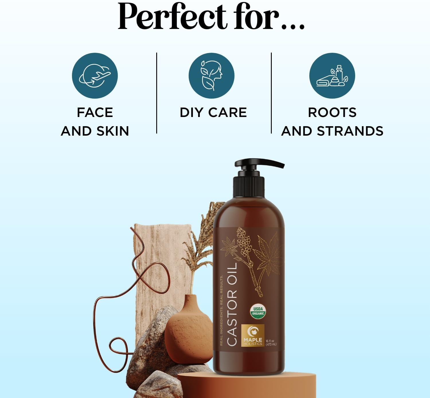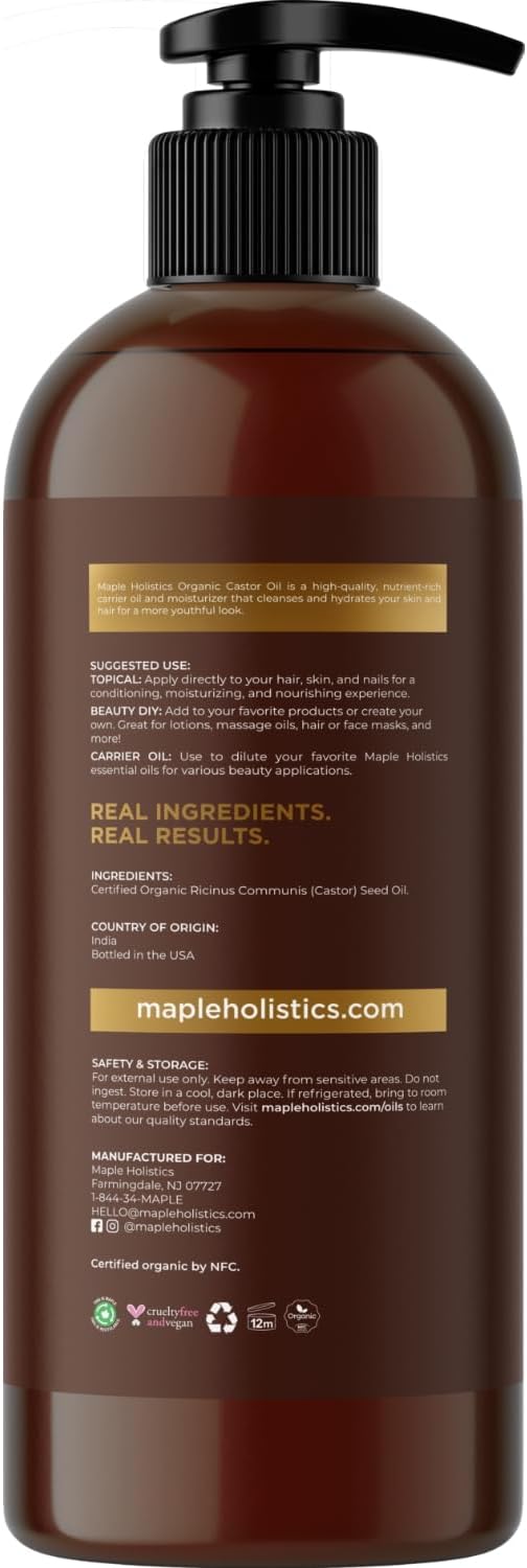 Hair and Scalp Oil - Our organic castor oil for hair growth can work wonders as a natural hair oil or dry scalp treatment for volumizing dry weak and thin hair leaving it looking softer and fullerOrganic Body Oil - Reap the benefits of pure castor oil for belly button to help support the body such as using castor oil for liver detox or castor oil for face care to look & feel younger than everCastor Oil for Eyebrows - Try our organic hexane free castor oil for lashes and brows for a visible boost with that will astonish and see the difference a pure and simple lash and brow serum can makeCarrier Oil for Essential Oils - Thereās no limit when mixing our oils for all sorts of DIY health and beauty products so find your favorite combo today like a castor rosemary and peppermint hair oilMaple Holistics Quality - We believe in real ingredients for real results which is why we expanded our line of pure and natural oils to include many certified organic oils for hair skin and nailsHexane Free Organic Castor Oil - USDA Organic Castor Oil for Body Detox Hair Growth & Skin Care - Extra Virgin Organic Hair Oil for Dry Damaged Hair and Carrier Oil for Essential Oils Mixing (16oz)