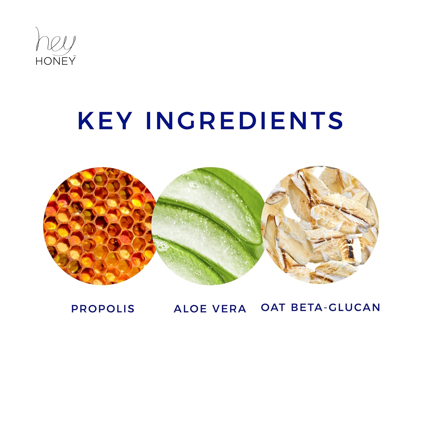 About this item 99% Natural Blend for All Skin Types: Crafted with Bee Propolis and Honey extracts, this formula aims to clarify, balance, and restore complex and compromised skin. Soothing and Hydrating Ingredients: Enriched with Oat Beta Glucan and an Amino Acid Complex for skin comfort. Additional moisturizing agents like Sodium Lactate help maintain a balanced complexion. Flexible Skincare Routine: Apply 3 to 4 drops directly or blend a tiny drop with your favorite foundation for an added complexion boost. Use morning or night to customize your skincare regimen. Target Acne and Reduce Redness: Specifically formulated to alleviate signs of acne, skin discomfort, and redness. Ideal for both facial and body application. Clean and Cruelty-Free Commitment: This formula is made with 99% natural ingredients and is free from harsh chemicals. Hey Honey is committed to ethical practices and does not test on animals. See more product details,99% Natural Blend for All Skin Types: Crafted with Bee Propolis and Honey extracts, this formula aims to clarify, balance, and restore complex and compromised skin,Soothing and Hydrating Ingredients: Enriched with Oat Beta Glucan and an Amino Acid Complex for skin comfort. Additional moisturizing agents like Sodium Lactate help maintain a balanced complexion,Flexible Skincare Routine: Apply 3 to 4 drops directly or blend a tiny drop with your favorite foundation for an added complexion boost. Use morning or night to customize your skincare regimen,Target Acne and Reduce Redness: Specifically formulated to alleviate signs of acne, skin discomfort, and redness. Ideal for both facial and body application,Clean and Cruelty-Free Commitment: This formula is made with 99% natural ingredients and is free from harsh chemicals. Hey Honey is committed to ethical practices and does not test on animals