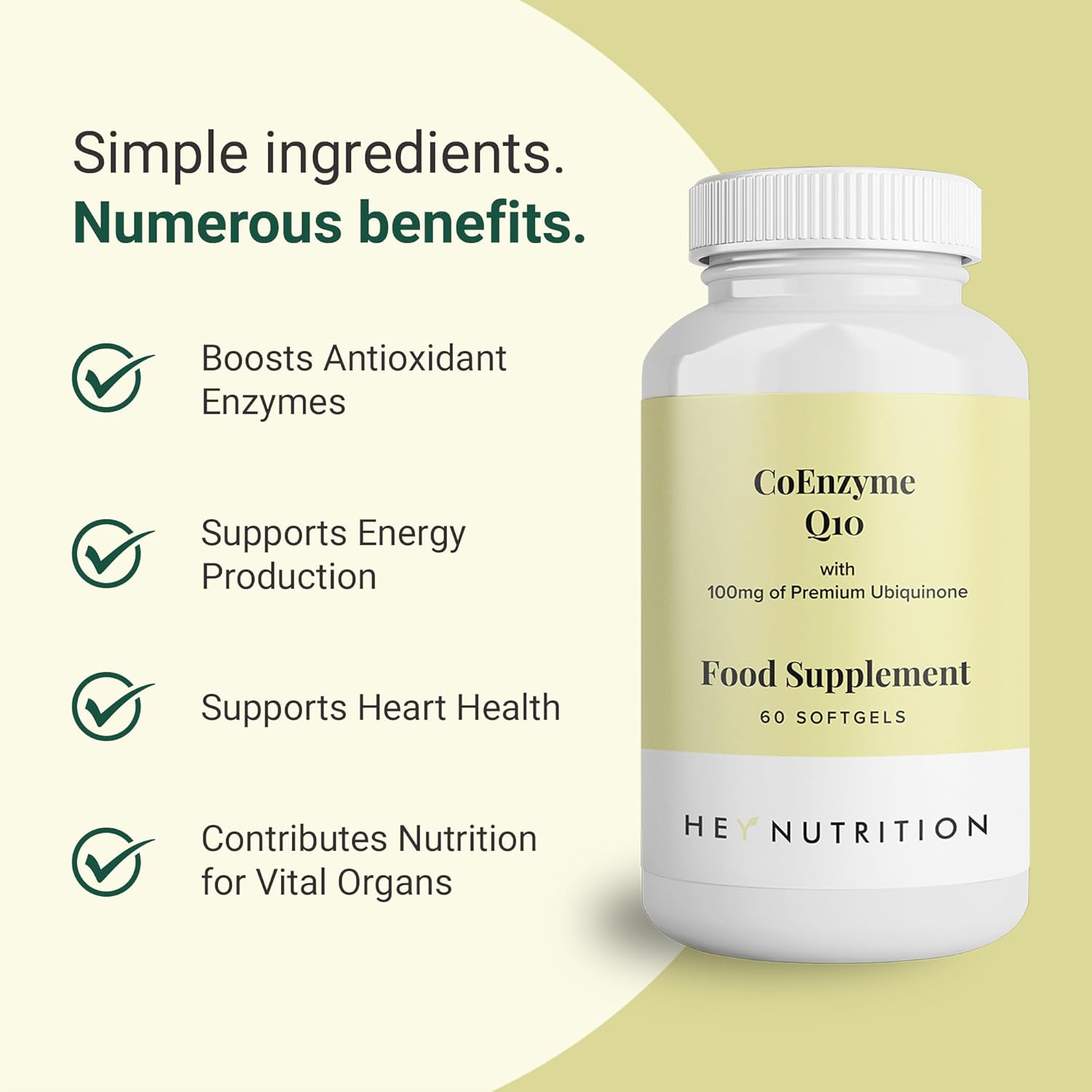 Hey Nutrition Coenzyme Q10 Supplement - 100Mg Of Premium Ubiquinone - Boosts Antioxidant Enzymes - Contributes Nutrition For Vital Organs - Non-Gmo & Pesticide-Free - Uk Manufactured - 60 Softgels