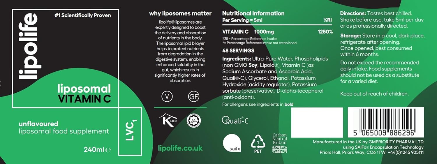 High Strength Liposomal Vitamin C For Advanced Nutrient Absorption. Formulated With Quali-C And Manufactured In The Uk By Liposomal Experts. 2 Bottles Lipolife Lvc1