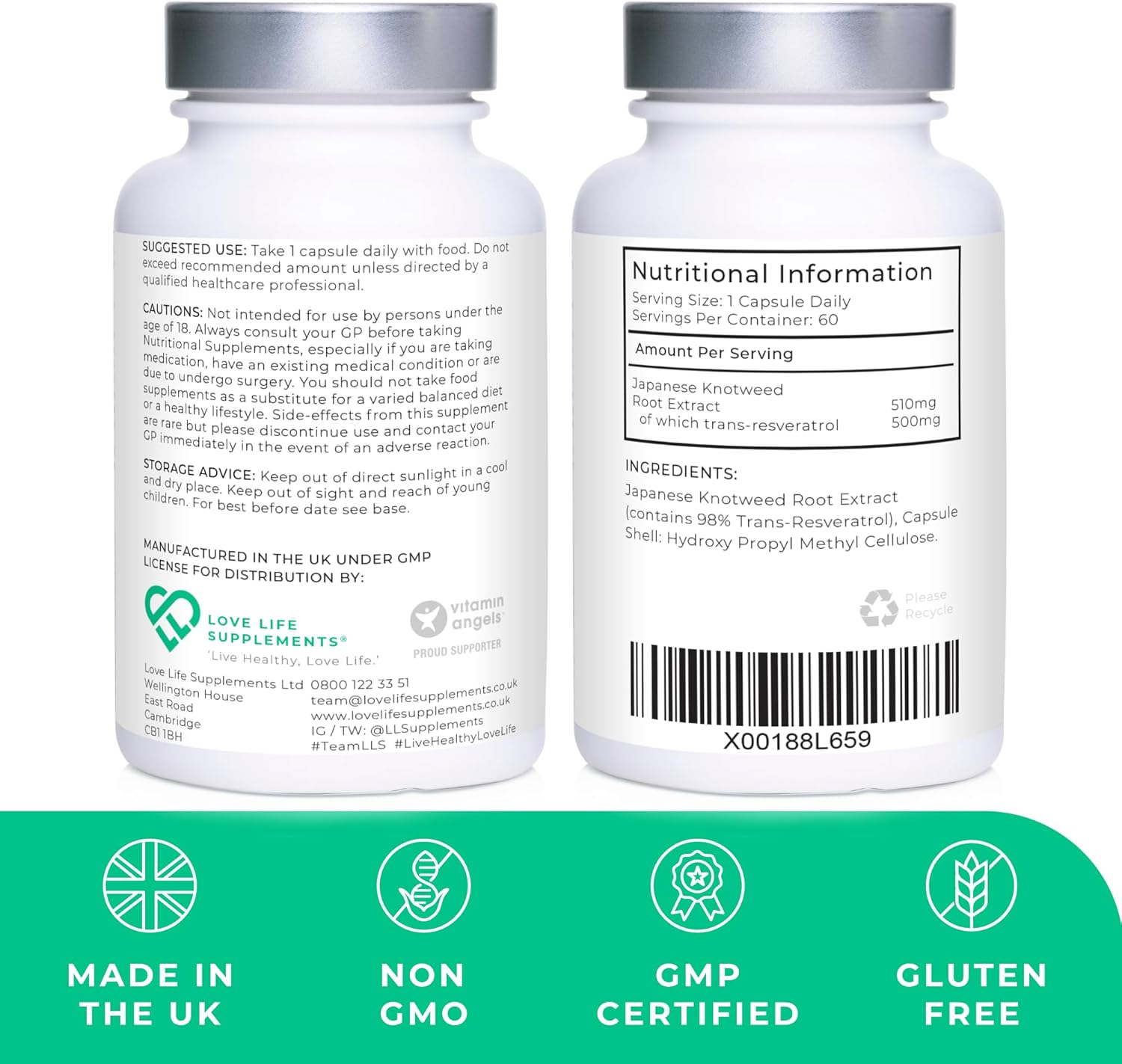 High Strength Trans-Resveratrol - 98% Purity (3Rd Party Tested) | 500Mg X 60 Capsules / 60 Servings | From Japanese Knotweed Root Extract | Pure Fill (Nothing Else Added) | Love Life Supplements