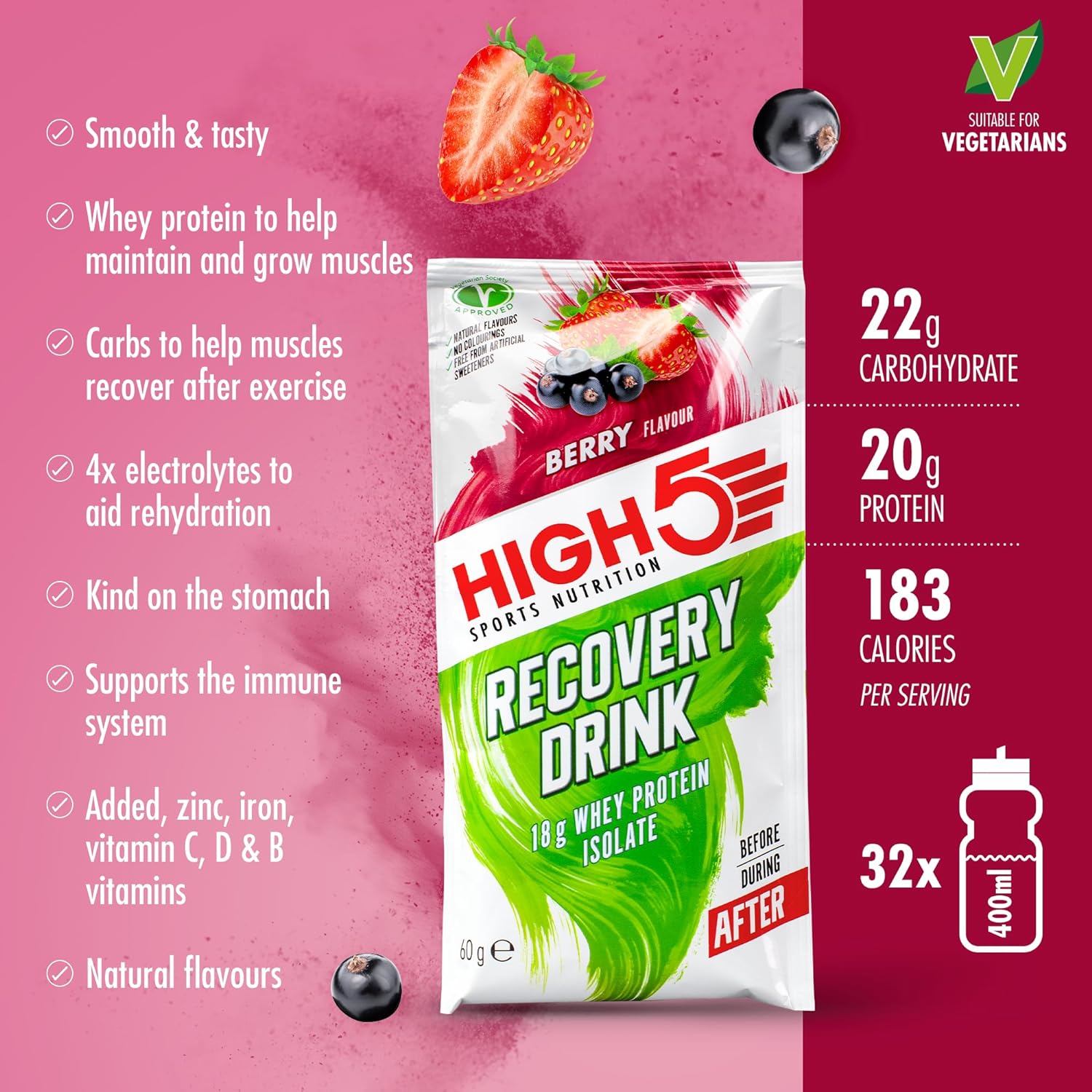 HIGH5 Recovery Drink is made with natural fruit flavourings and is free from artificial sweeteners and colourings
