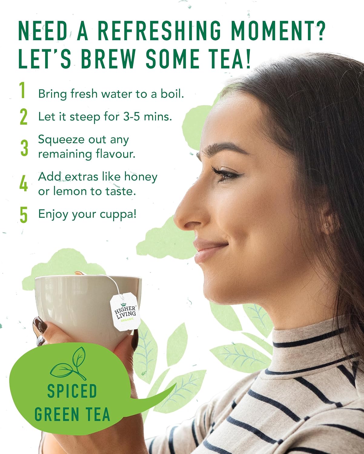 Higher Living Green Tea Chai - Energising, Caffeine Infused Organic Herbal Tea With Cinnamon, Cloves & Cardamom Spices - 4 Boxes, 20 Bags Each