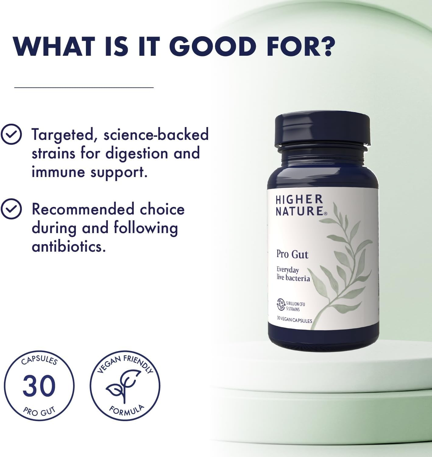 Higher Nature - Pro Gut - High Strength Probiotic Cultures - Multi-Strain Probiotic For Digestive System - Everyday Live Bacteria - 5 Billion Cfus - For Good Gut Flora, Gas & Bloating - 30 Capsules