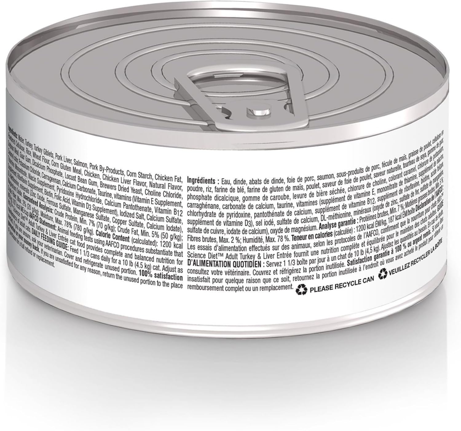 Product Description Help Keep Your Cat Fit And Healthy With Hill'S Science Diet Adult Turkey & Liver Entrée Wet Cat Food. With Its High-Quality Ingredients And Easy-To-Digest Formula, This Science Diet Pet Food Provides Precisely Balanced Nutrition To Help Keep Your Cat Fit And Healthy. Plus, Your Cat Will Love The Delicious Flavor And Soft, Smooth Texture Of This Turkey & Liver Cat Food. Hill'S Science Diet Adult Turkey & Liver Entrée Contains No Artificial Flavors Or Preservatives. Hill’S Science Diet Cat Food Is Made In The Usa With Global Ingredients You Can Trust. *Hill’S 100% Satisfaction Guarantee: We'Re Confident Your Pet Will Enjoy Hill'S Science Diet Foods. We'Re So Confident That We Offer A 100% Money-Back Guarantee. If You Are Unsatisfied For Any Reason, Return The Unused Portion To Amazon For A Full Refund Or Replacement. For More Information On Returning An Amazon Purchased Product, Visit The Amazon Returns Center. From The Manufacturer Hill’S Pet Nutrition’S Mission: To Help Enrich And Lengthen The Special Relationships Between People And Their Pets. More Than 220 Veterinarians, Food Scientists, Technicians And Ph.D. Nutritionists At Hill'S Develop All Of Hill'S Pet Foods To Meet The Needs Of Your Pets. Hill’S Only Accepts Ingredients From Suppliers Whose Facilities Meet Stringent Quality Standards And Who Are Approved By Hill'S. Not Only Is Each Ingredient Examined To Ensure Its Safety, We Also Analyze Each Product'S Ingredient Profile For Essential Nutrients To Ensure Your Pet Gets The Stringent, Precise Formulation They Need. Hill’S Uses Only High-Quality Ingredients Including Real Chicken, Lamb Or Salmon Protein. Hill’S Dry Pet Foods Have Quality Protein As The First Ingredient And Provide Clinically Proven Antioxidant Benefits. Plus, They’Re Made With Natural Ingredients (Plus Vitamins, Minerals & Amino Acids) And Never Contain Artificial Colors, Flavors, Preservatives Or Chicken By-Product Meal. Hill’S Food, Shelter & Love Program Donates Food To Shelters Across The Country, Providing The Proper Nutrition That Helps Pets Find Their Way To Loving Homes. With Every Purchase Of Science Diet You Help Feed Over 100,000 Homeless Pets Every Day, 365 Days A Year