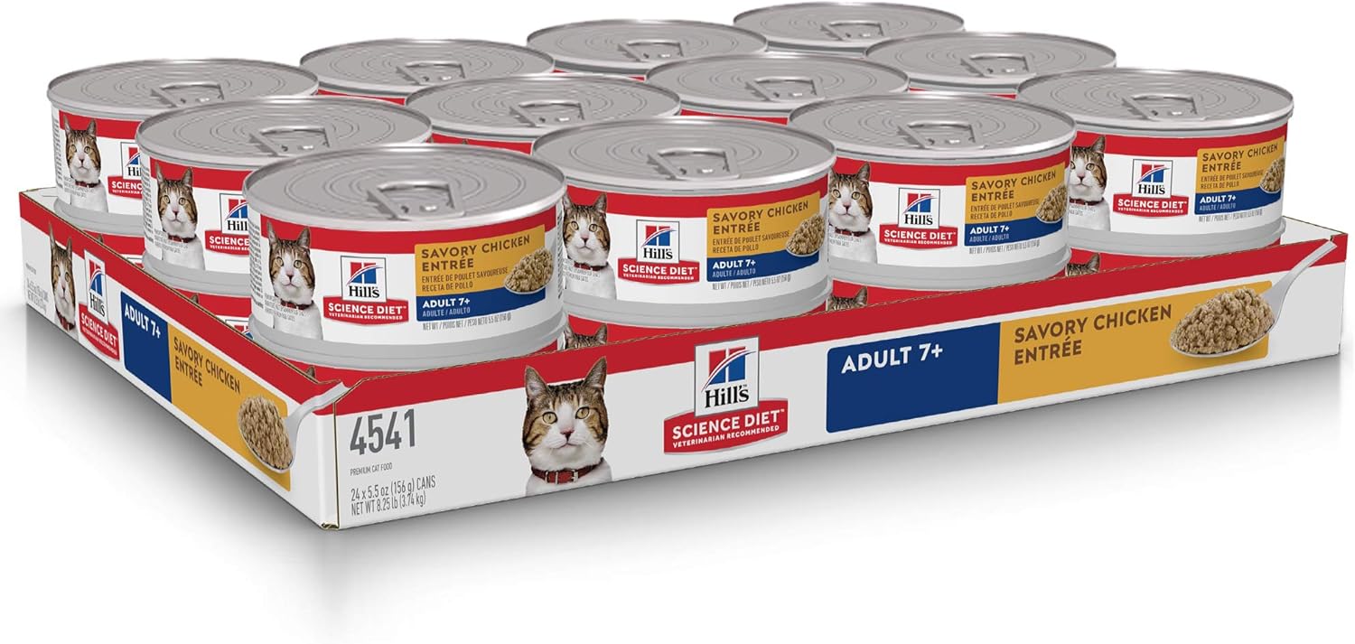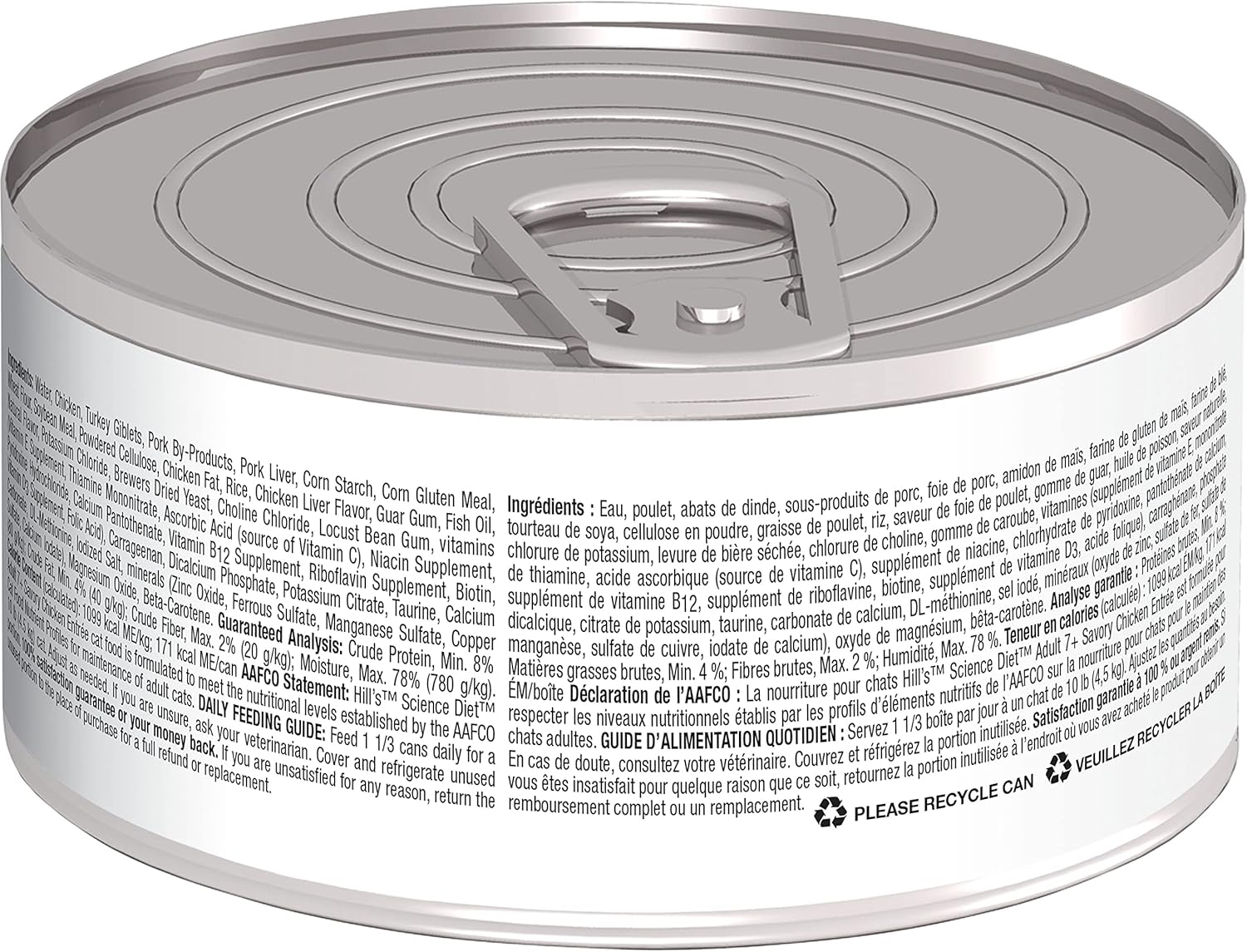Product Description Packed With High-Quality Protein For Lean Muscle, Hill'S Science Diet Adult 7+ Savory Chicken Entrée Canned Food Uses Real Chicken In A Succulent Wet Food Specially Formulated For Mature Cats. This Easy-To-Digest Senior Cat Food Made With Natural Ingredients Provides Older Felines With Lean Protein For Muscle Maintenance. Give The Perfect Balance Of Taste And Nutrition With This Smooth Canned Food Packed With Antioxidants Plus Vitamins C+E. There’S More To Love With The New Look Of Science Diet. Some Of Our Products Also Have New Names & New Formulas. From The Manufacturer Hill’S Pet Nutrition’S Mission: To Help Enrich And Lengthen The Special Relationships Between People And Their Pets. More Than 220 Veterinarians, Food Scientists, Technicians And Ph.D. Nutritionists At Hill'S Develop All Of Hill'S Pet Foods To Meet The Needs Of Your Pets. Hill’S Only Accepts Ingredients From Suppliers Whose Facilities Meet Stringent Quality Standards And Who Are Approved By Hill'S. Not Only Is Each Ingredient Examined To Ensure Its Safety, We Also Analyze Each Product'S Ingredient Profile For Essential Nutrients To Ensure Your Pet Gets The Stringent, Precise Formulation They Need. Hill’S Uses Only High-Quality Ingredients Including Real Chicken, Lamb Or Salmon Protein. Hill’S Dry Pet Foods Have Quality Protein As The First Ingredient And Provide Clinically Proven Antioxidant Benefits. Plus, They’Re Made With Natural Ingredients (Plus Vitamins, Minerals & Amino Acids) And Never Contain Artificial Colors, Flavors, Preservatives Or Chicken By-Product Meal. Hill’S Food, Shelter & Love Program Donates Food To Shelters Across The Country, Providing The Proper Nutrition That Helps Pets Find Their Way To Loving Homes. With Every Purchase Of Science Diet You Help Feed Over 100,000 Homeless Pets Every Day, 365 Days A Year