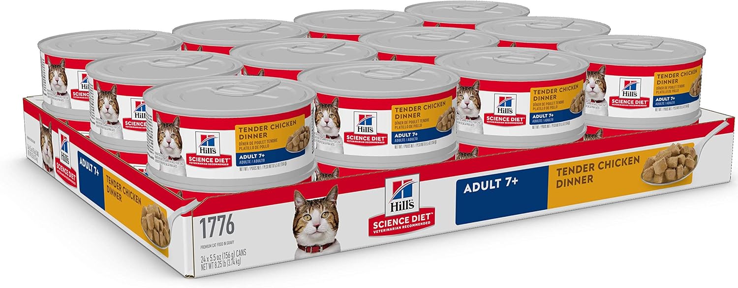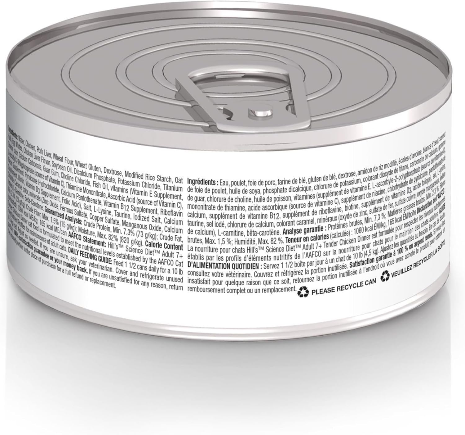 Product Description Packed With High-Quality Protein For Lean Muscle, Hill'S Science Diet Adult 7+ Tender Chicken Dinner Gives Your Older Cat A Perfect Balance Of Tender, Real Chicken Chunks And The Precise Nutrition He Or She Needs. This Easy-To-Digest Senior Cat Food Made With Natural Ingredients Is A Fantastic Option To Support Your Aging Cat'S Health During The Golden Years. ThereāS More To Love With The New Look Of Science Diet. Some Of Our Products Also Have New Names & New Formulas. From The Manufacturer HillāS Pet NutritionāS Mission: To Help Enrich And Lengthen The Special Relationships Between People And Their Pets. More Than 220 Veterinarians, Food Scientists, Technicians And Ph.D. Nutritionists At Hill'S Develop All Of Hill'S Pet Foods To Meet The Needs Of Your Pets. HillāS Only Accepts Ingredients From Suppliers Whose Facilities Meet Stringent Quality Standards And Who Are Approved By Hill'S. Not Only Is Each Ingredient Examined To Ensure Its Safety, We Also Analyze Each Product'S Ingredient Profile For Essential Nutrients To Ensure Your Pet Gets The Stringent, Precise Formulation They Need. HillāS Food, Shelter & Love Program Donates Food To Shelters Across The Country, Providing The Proper Nutrition That Helps Pets Find Their Way To Loving Homes. With Every Purchase Of Science Diet You Help Feed Over 100,000 Homeless Pets Every Day, 365 Days A Year