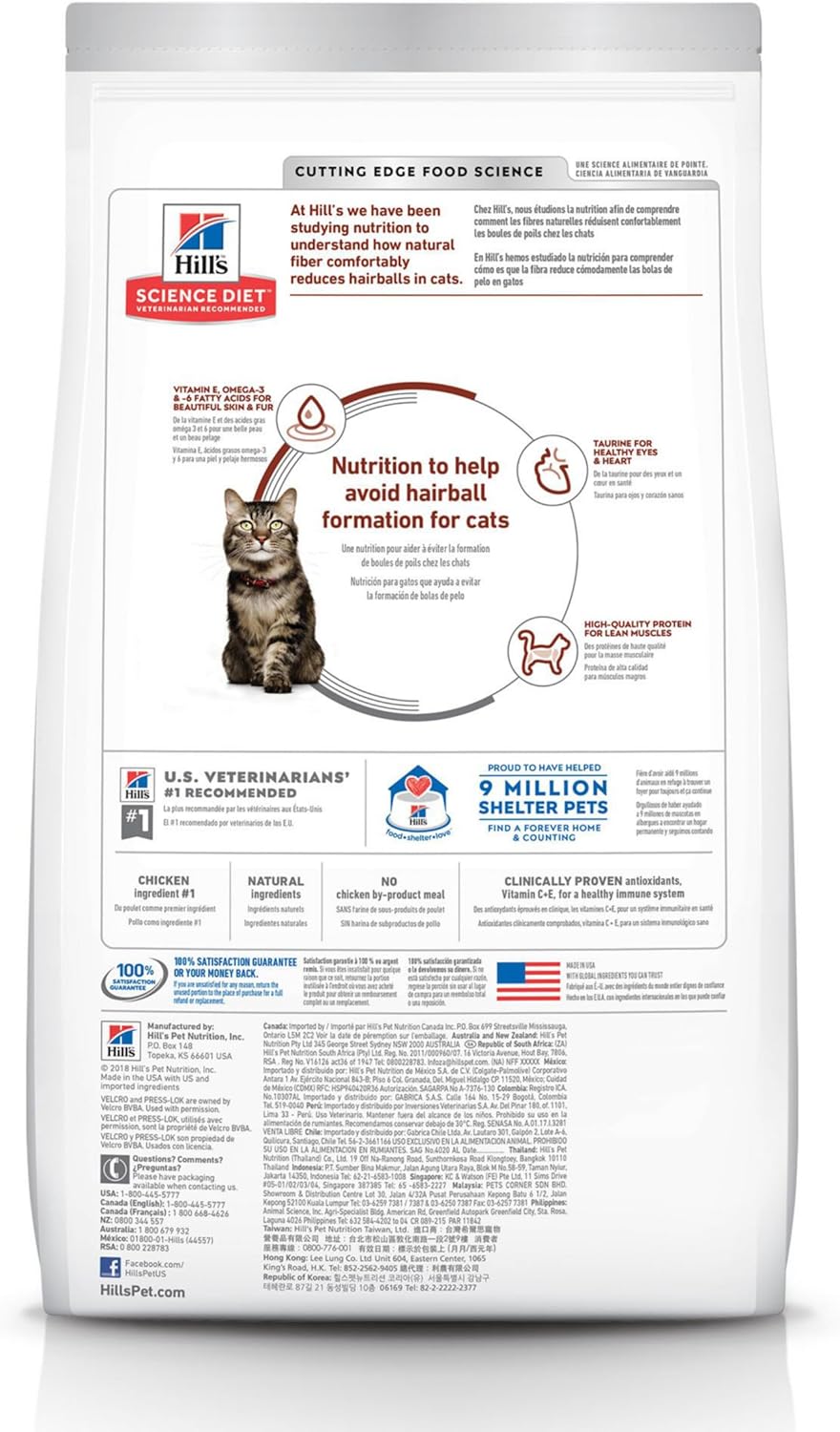 Product Description Hairballs Are A Natural Occurrence For Cats, But If They'Re More Frequent Than You'D Like, Your Senior Cat May Need A Nutritional Solution. Hill'S Science Diet Hairball Control Adult 7+ Dry Cat Food Provides Nutrition To Help Avoid Hairball Formation For Mature Cats. Packed With Quality Protein For Lean Muscle Maintenance, This Cat Food Made With Natural Ingredients Uses Omega-3 And Omega-6 Fatty Acids To Nourish Your Cat'S Skin And Fur. To Support Your Older Cat'S Kidneys And Heart Health, This Senior Cat Food Provides Essential Taurine. There'S More To Love With The New Look Of Science Diet. Some Of Our Products Also Have New Names, New Kibble Shapes & New Formulas. From The Manufacturer Hill’S Pet Nutrition’S Mission: To Help Enrich And Lengthen The Special Relationships Between People And Their Pets. More Than 220 Veterinarians, Food Scientists, Technicians And Ph.D. Nutritionists At Hill'S Develop All Of Hill'S Pet Foods To Meet The Needs Of Your Pets. Hill’S Only Accepts Ingredients From Suppliers Whose Facilities Meet Stringent Quality Standards And Who Are Approved By Hill'S. Not Only Is Each Ingredient Examined To Ensure Its Safety, We Also Analyze Each Product'S Ingredient Profile For Essential Nutrients To Ensure Your Pet Gets The Stringent, Precise Formulation They Need. Hill’S Uses Only High-Quality Ingredients Including Real Chicken, Lamb Or Salmon Protein. Hill’S Dry Pet Foods Have Quality Protein As The First Ingredient And Provide Clinically Proven Antioxidant Benefits. Plus, They’Re Made With Natural Ingredients (Plus Vitamins, Minerals & Amino Acids) And Never Contain Artificial Colors, Flavors, Preservatives Or Chicken By-Product Meal. Hill’S Food, Shelter & Love Program Donates Food To Shelters Across The Country, Providing The Proper Nutrition That Helps Pets Find Their Way To Loving Homes. With Every Purchase Of Science Diet You Help Feed Over 100,000 Homeless Pets Every Day, 365 Days A Year