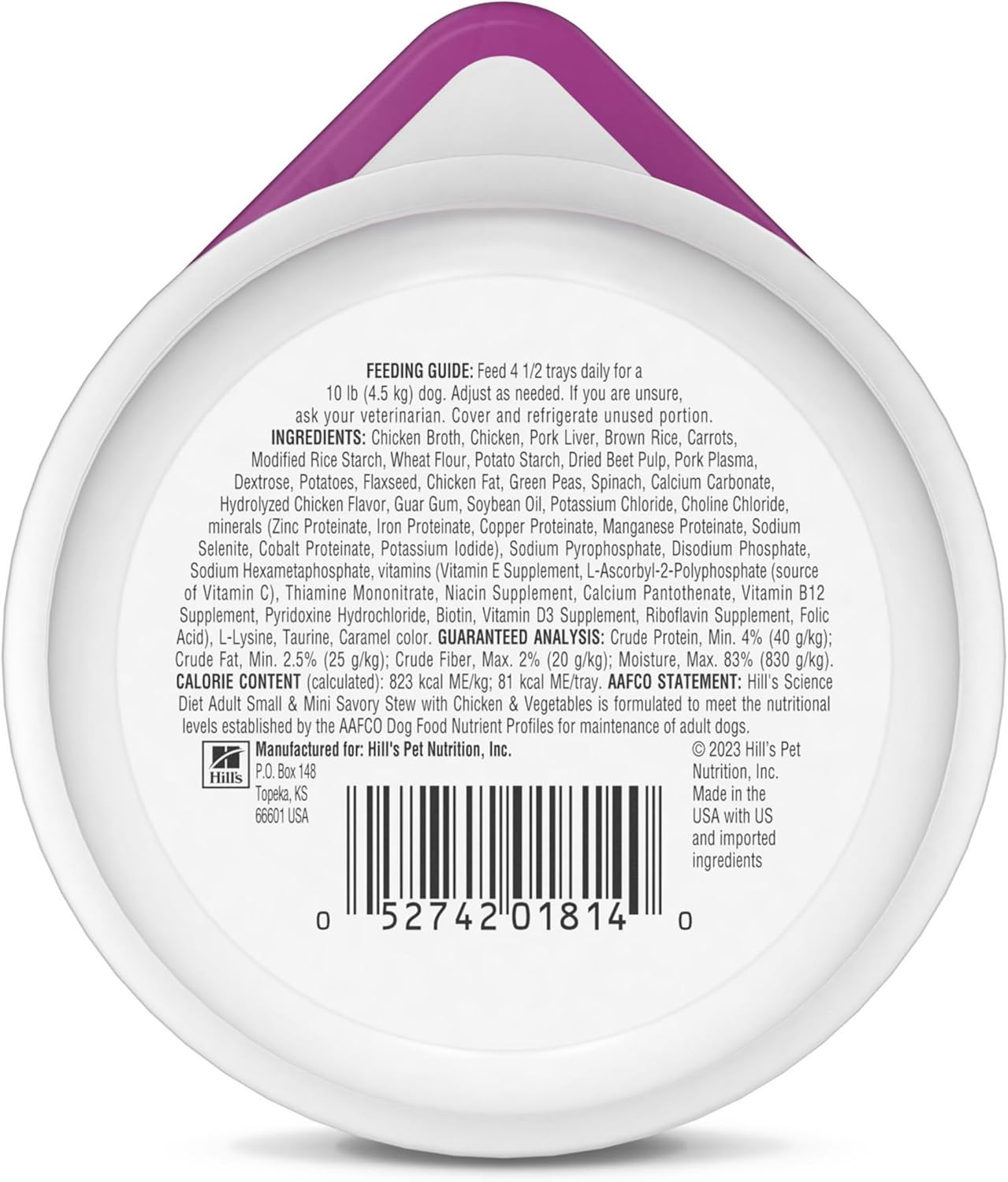Mealtime Has Never Been Easier – Or More Delicious – For Your Little Dog! Just Peel Back The Top Of Hill’S New Single Serve Trays For A Delicious Way To Provide Precisely Balanced Nutrition That Enhances The Overall Health And Well-Being Of Your Pet. Hill'S Science Diet Adult Small & Toy Savory Stews Use High-Quality Lean Proteins To Help Maintain Ideal Body Conditions And Gentle Fibers To Promote Healthy Digestion. Expertly Developed By Hill’S Nutritionists And Veterinarians, Science Diet Dog Food Is A Tasty, Healthy Choice For Your Dog. Hill’S 100% Satisfaction : We'Re Confident Your Pet Will Enjoy Hill'S Science Diet Foods. We'Re So Confident That We Offer A 100% Money-Back . If You Are Unsatisfied For Any Reason, Return The Unused Portion To For A Full Refund Or Replacement. For More Information On Returning An Purchased Product, Visit The Returns Center