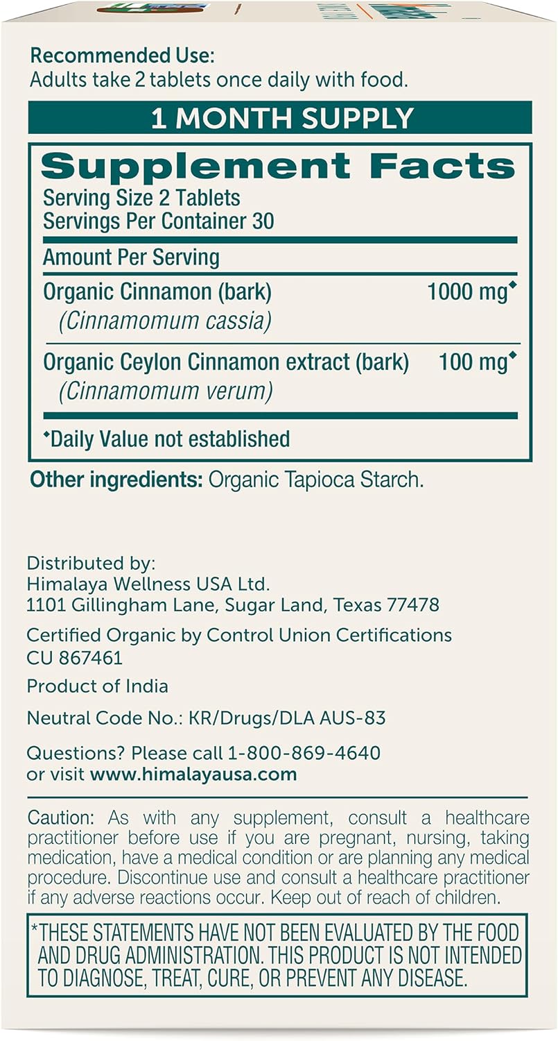 Himalaya Organic Cinnamon, 30 Day Supply - Herbal Glucose Metabolism Support - Usda Organic, Non-Gmo, Vegan, Gluten Free, 1100 Mg, 60 Tablets