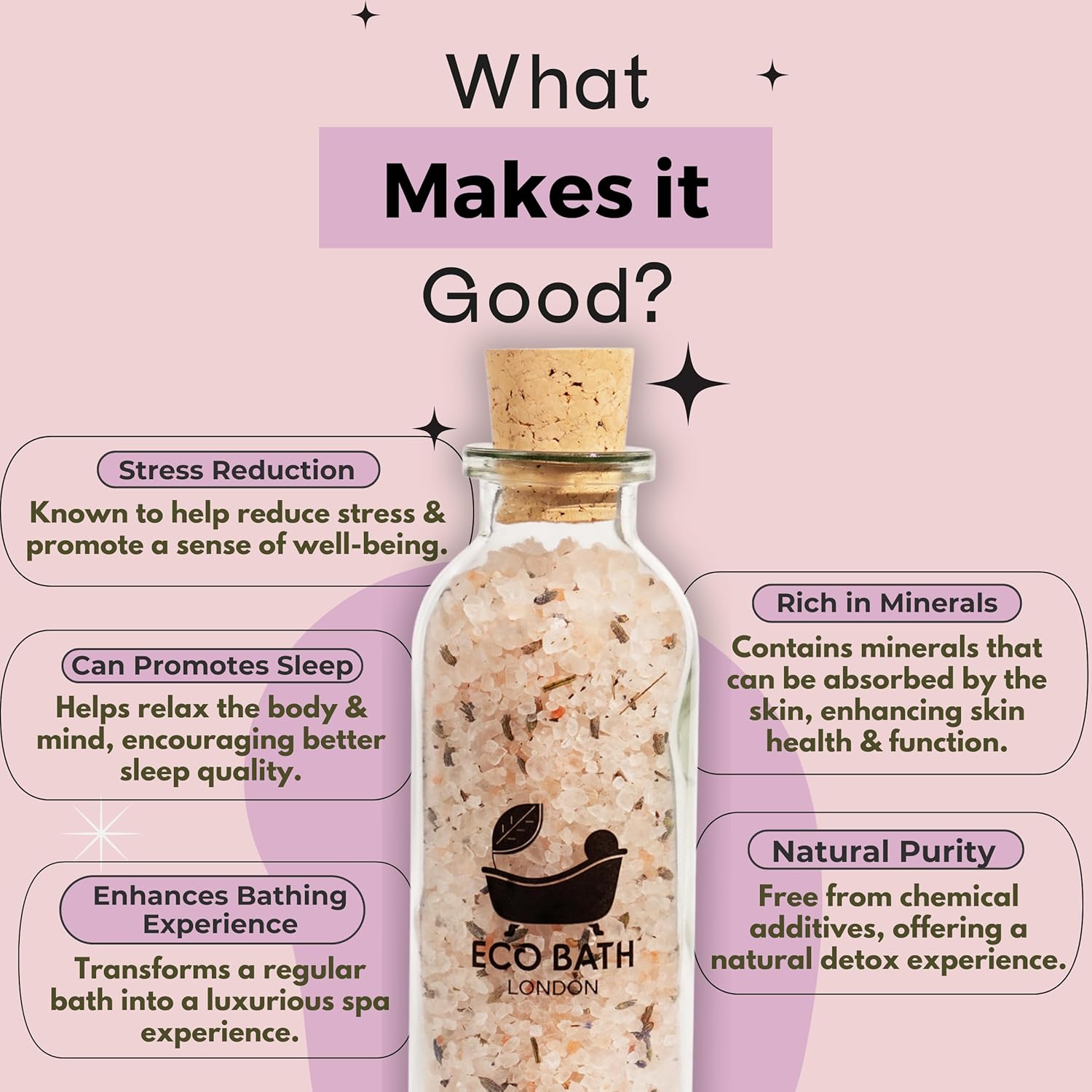 Indulge in the ultimate relaxation experience with the Eco Bath London Refreshing Himalayan Bath Salt. Sourced from the pristine Himalayan mountains, this premium pink salt is rich in minerals, including magnesium, known for its therapeutic properties. Each 300g jar of Himalayan bath salt offers a refreshing and rejuvenating bath experience that helps to detoxify your body, soothe aching muscles, and soften your skin. The natural composition of Himalayan salt provides a unique blend of essential minerals that promote relaxation, improve circulation, and enhance your overall well-being. Perfect for a luxurious bath after a long day, this salt is also ideal for creating a spa-like atmosphere at home. Our Himalayan bath salt is free from additives and chemicals, ensuring a pure and natural bathing experience. The salts dissolve easily in warm water, releasing beneficial minerals that help to relax your mind and body. Whether you are looking to unwind after a stressful day or to relieve muscle tension after an intense workout, the Eco Bath London Refreshing Himalayan Bath Salt is the perfect addition to your self-care routine. The refreshing scent enhances the bathing experience, leaving you feeling invigorated and revitalized. Eco Bath London is committed to providing high-quality, natural products that are environmentally friendly and sustainably sourced. Our Himalayan bath salt comes in eco-friendly packaging, making it a great choice for those who are conscious of their environmental impact. Treat yourself or a loved one to the benefits of Himalayan pink salt and enjoy a moment of tranquility and self-care,PREMIUM HIMALAYAN PINK SALT: Sourced from the Himalayan mountains, our bath salt is rich in essential minerals, including magnesium, that provide therapeutic benefits and enhance your bathing experience,SOOTHES AND RELAXES: The magnesium and other minerals in the Himalayan salt may help to soothe aching muscles, making it perfect for a calming bath after a long day,SOOTHING LAVENDER AROMA: Infused with the calming scent of lavender, this bath salt helps reduce stress, improve sleep quality, and promote a sense of tranquility,DETOXIFIES AND REJUVENATES: The natural composition of the pink salt can help to detoxify the body, improve circulation, and rejuvenate the skin, leaving it soft and refreshed,NATURAL AND ADDITIVE-FREE: Our bath salt is free from additives and chemicals, ensuring a pure, natural, and safe bathing experience for all skin types,EASY TO USE: Simply dissolve a generous amount of the Himalayan bath salt in warm water, and let the minerals work their magic. The refreshing scent enhances the experience, providing a spa-like atmosphere at home