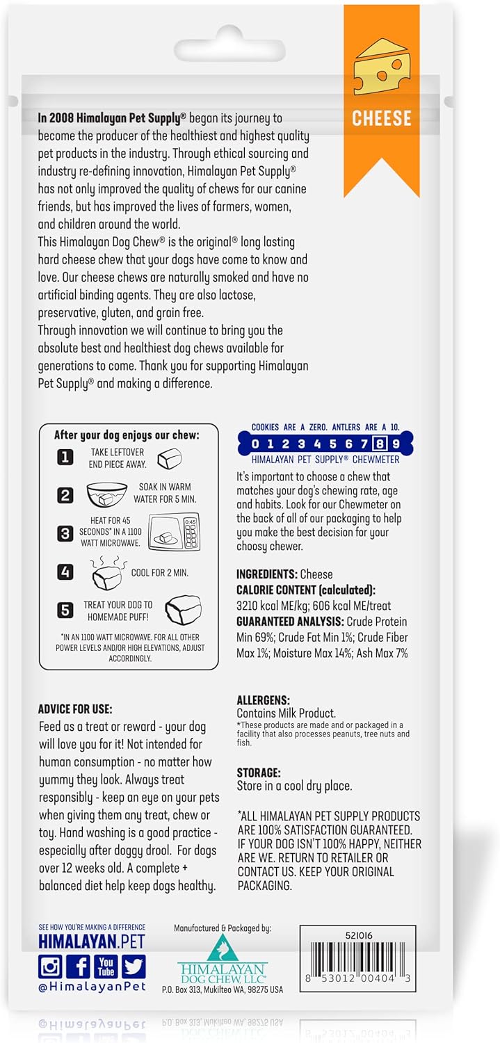 Big Dog Himalayan Cheese Chews Are For Big Dogs. Choose A Chew That Matches Your Dog'S Chewing Rate, Age And Habits! The Right Chew Can Make All The Difference For Your Dog. Do You Have An Aggressive Or Passive Chewerhard Dog Chews Are Considered Especially "Stimulating Chews" Because They Entertain Your Dog For Hours, Stimulating Their Mind And Satisfying Your Dog'S Need To Chew. Hard Chews Support Healthy Chewing Habits & Combat Boredom.Do You Have An Aggressive Chewer The Harder The Chew Is, The More Gratifying It Is For An Assertive Chewer. Our Big Dog Himalayan Dog Chews Are A Perfect Choice For Your Dog! They Are Long Lasting Hard Hard Cheese Chews That Big Aggressive Chewers Love! Approx. 45 Seconds To Create A Cheesy Puffed Treat. Let It Cool For At Least 2 Minutes And Treat Your Dog To A Homemade Himalayan Cheese Puff